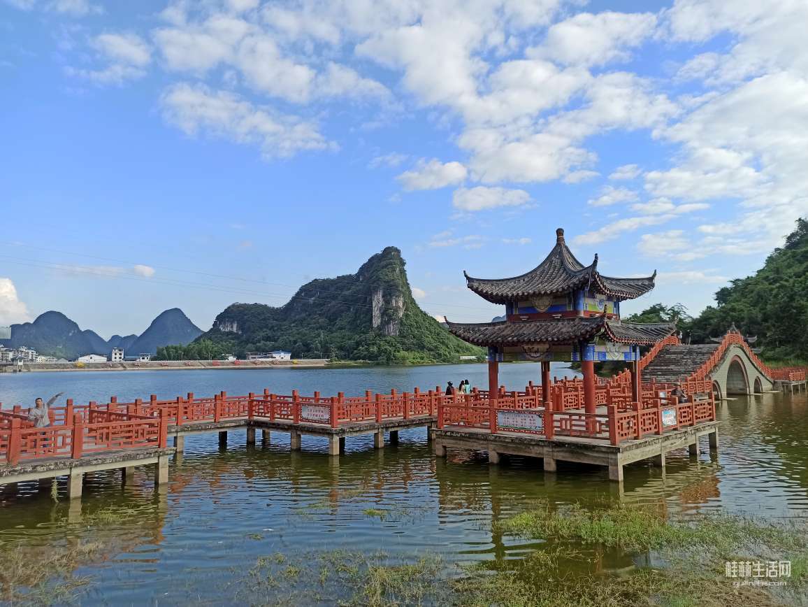 罗城成龙湖公园。蓝天白云,清澈湖面配以具有仫佬族风格的桥亭廊阁,不凡有身着民族服饰的小姐姐点缀。身临其中,如同在山水画中行走,清新雅致!。。。