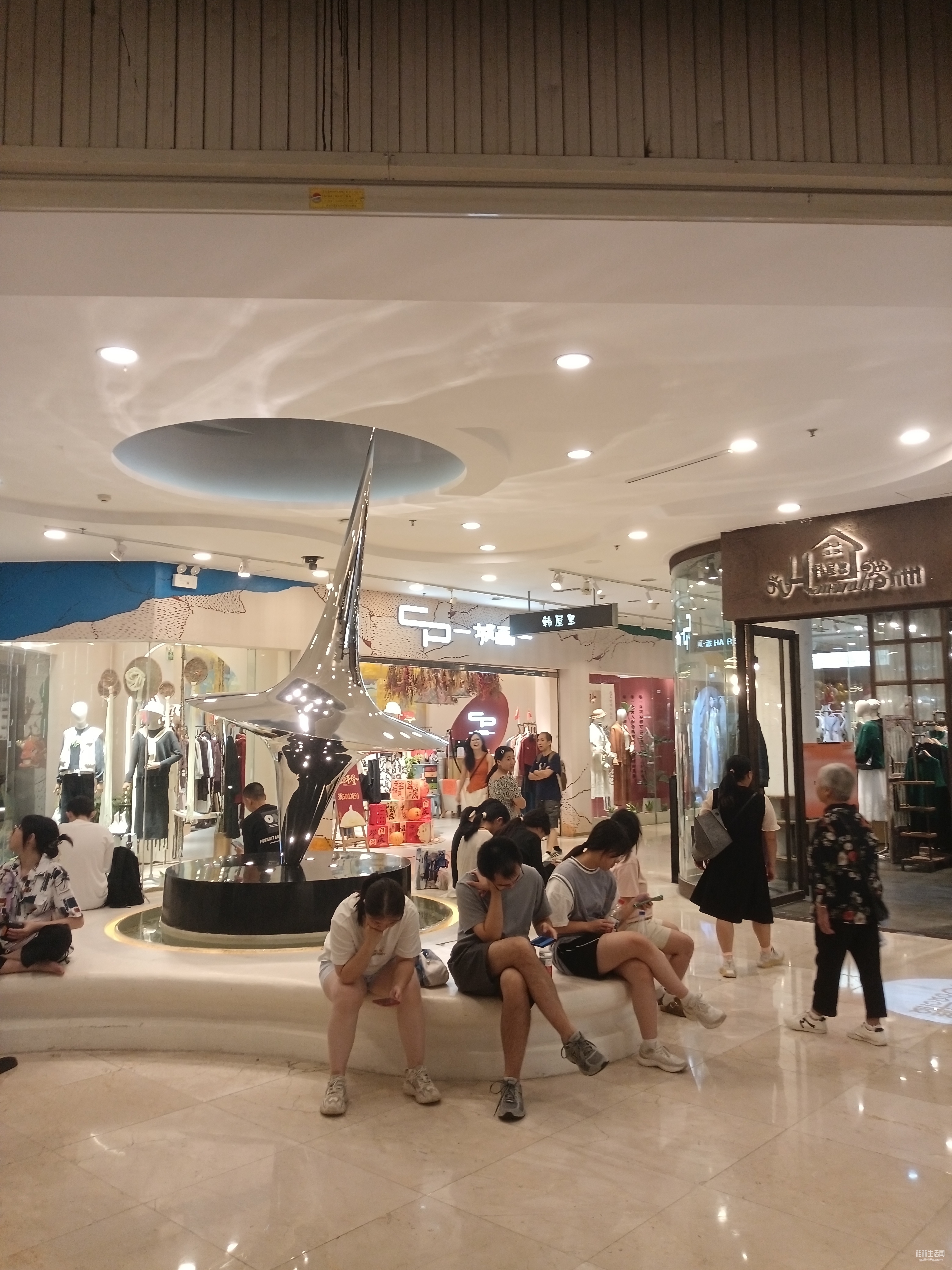 步行街的街心休息处。步行街冷气十足,布局也让人感觉很舒适,到处都有供游人休息的座椅,来此闲逛乘凉的人真多。