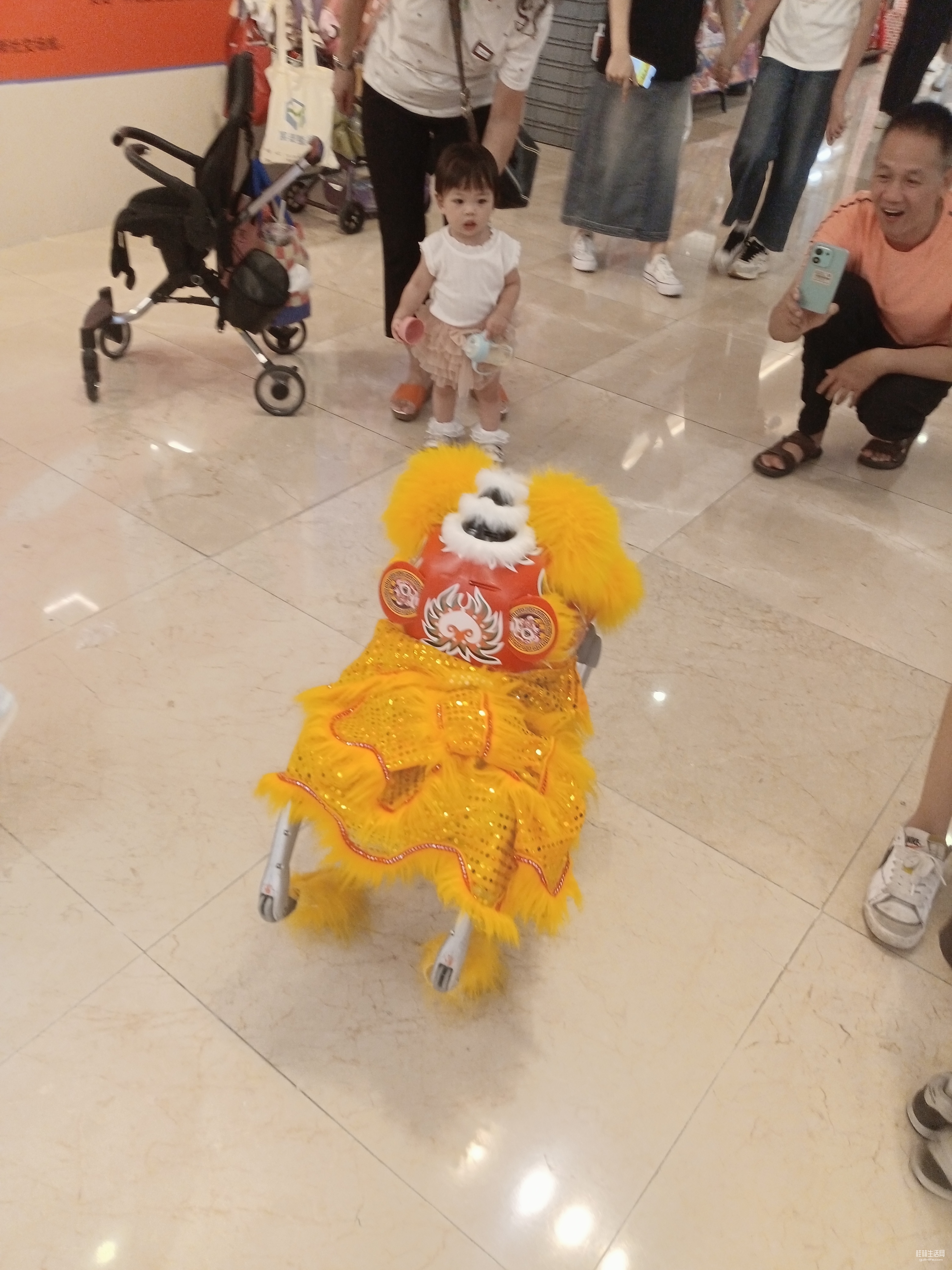 在步行街表演的机器小狮子。机器小狮子和小朋友互动,其乐融融。
