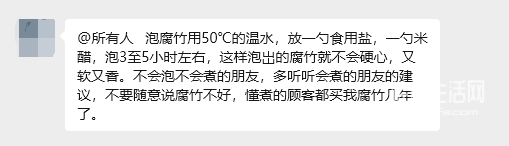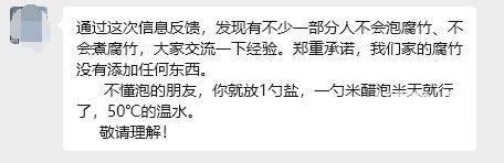 第二天老板也回应了腐竹问题,但他把这种情况归为大家不懂泡腐竹,是非常懂转嫁矛盾的,但他说的方法也不统一,第一次说泡3-5小时,第二次又说泡半天,看来他自己都对自己的腐竹心里没底。
