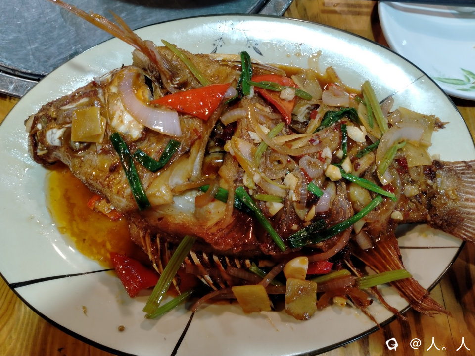 晚上在开平一家餐馆,先点了半只白切鸡,然后又要了一条红烧鱼,一碟青菜。