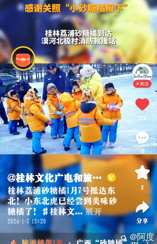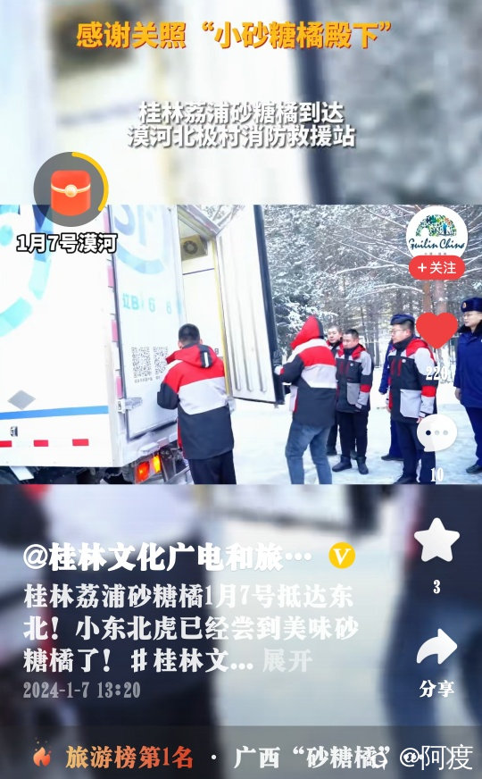 今天早上,央广有大篇幅报道桂林文旅部长**,送桂林特产砂糖橘到黑龙江的消息,甚至到中国的最北边的漠河,