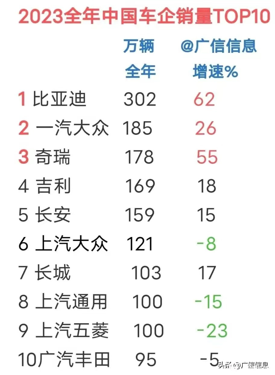 1月9日中国汽车 协会发布数据显示,2023全年中国乘用车销量前十车企是:比亚迪,一汽大众,奇瑞,吉利,长安,上汽大众,上汽通用,长城,上汽通用,上汽通用五菱,广汽丰田。销量前十车企中6家自主车企,4家合资车企。