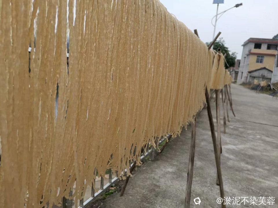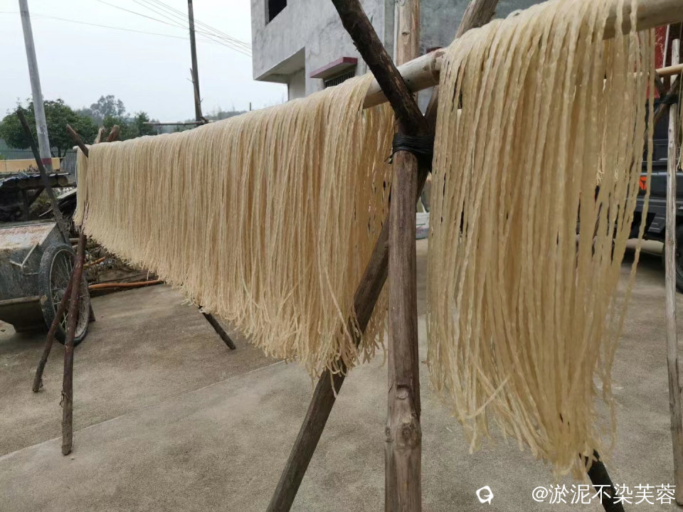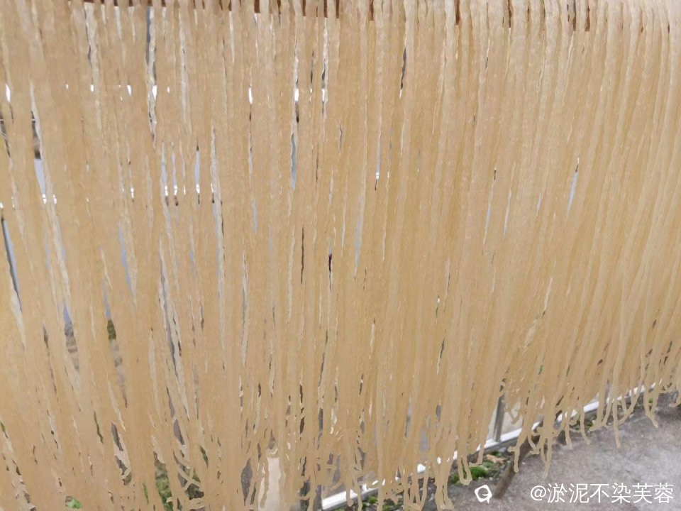 小时候见过红薯粉的制作过程,纯手工的,把红薯洗干净用石臼冲成浆糊状,一口大缸上面放置竹筛,铺上纱布,把粉碎后的红薯浆加水倒进竹筛过滤,过滤后的红薯渣渣可以喂猪,大缸里的水沉淀一天后,把水放掉,缸底露出白色的淀粉,把淀粉铲出来,最下层的不要,因为太多沙子,也不会浪费,可以喂猪。红薯淀粉加水稀释,上柴火灶用一口平底锡锅蒸熟,蒸熟后趁热马上拉薄,冷了就拉不动了,之后挂起来晾干,晾干切成丝,这就是农村红薯粉的制作过程,纯天然的,不添加。过年时吃红薯粉,放几个酸辣椒,放肉汤,味道一般般,没有龙口粉丝好吃。