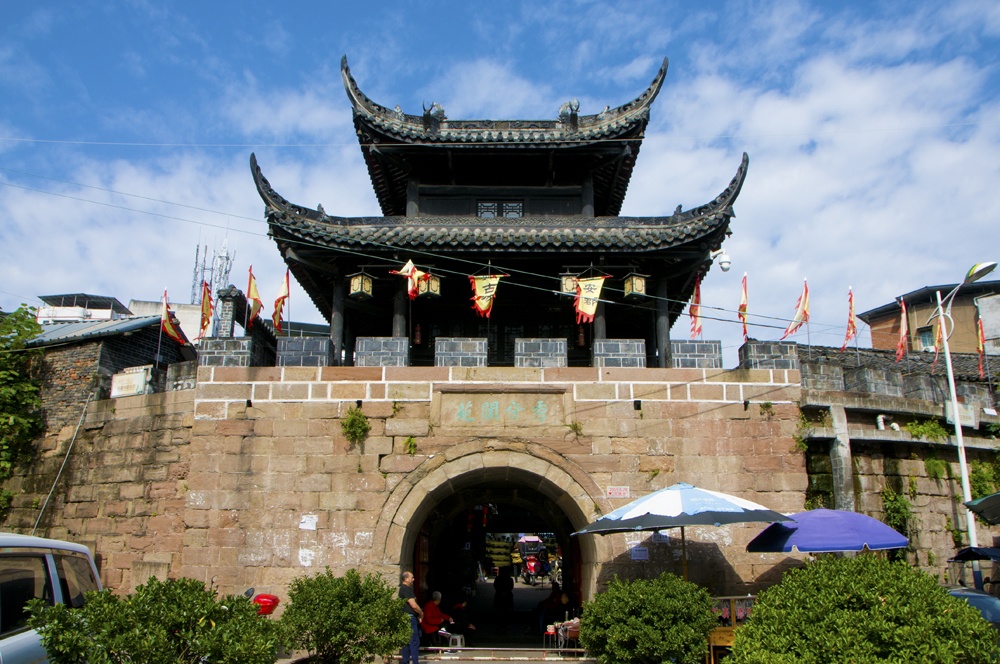 当年的六座城门,如今只剩下一座保存完好的古南门,南城门门高3.5米,3.4米,门上有二层箭楼,高8米。城门里有石阶梯可登城楼,城楼上的黑漆木柱高梁、翘角飞檐依然是旧时模样。