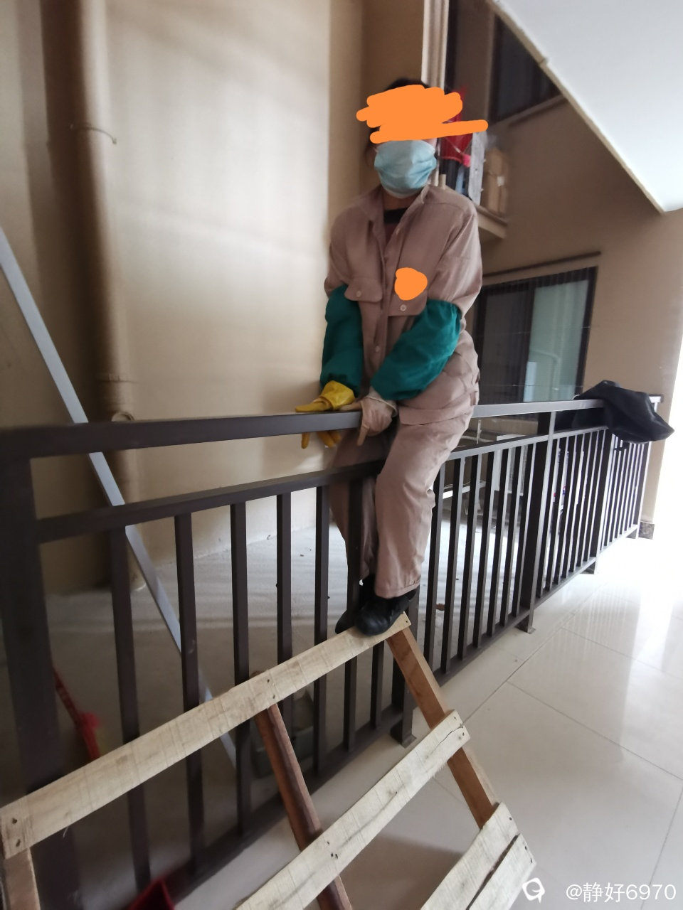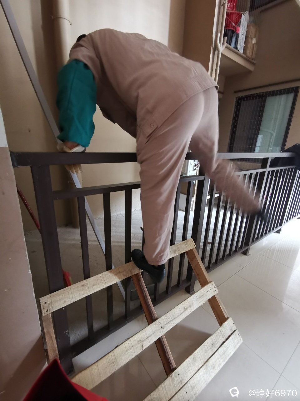 今天经过楼道时,见一个保洁阿姨差点从一块木板上面摔下来,她见我走过去,连忙把我叫住,让我帮她顶一下简易的“梯子”,原来她需要爬进去铁栏杆里面扫垃圾。