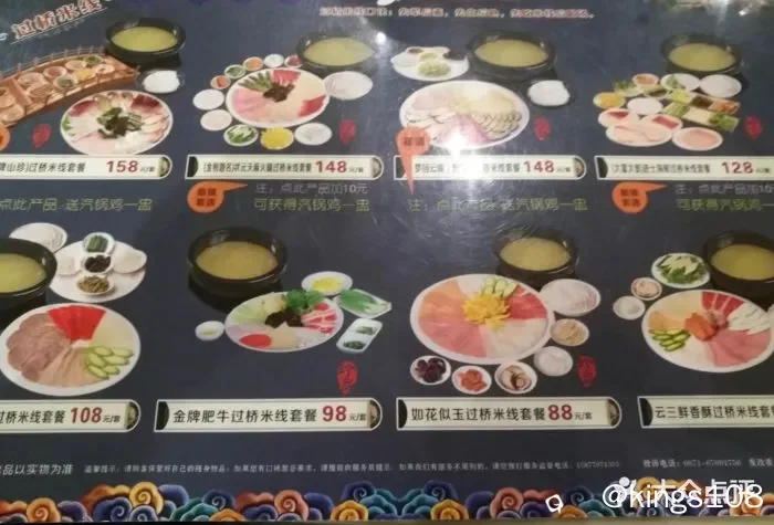 套餐的形式,其实更符合外地游客的消费需求。比方,云南的过桥米线就有10块左右便宜的简单款式,也有价格较贵的套餐,大多数人到昆明出差旅游,就喜欢去找60-80块钱的过桥米线套餐,一碗热油汤,许多盘切好的肉片和菜,还有一个小汽锅鸡,自己把肉菜和米粉放到热油汤里冒熟吃,吃罢神清气爽,非常过瘾。