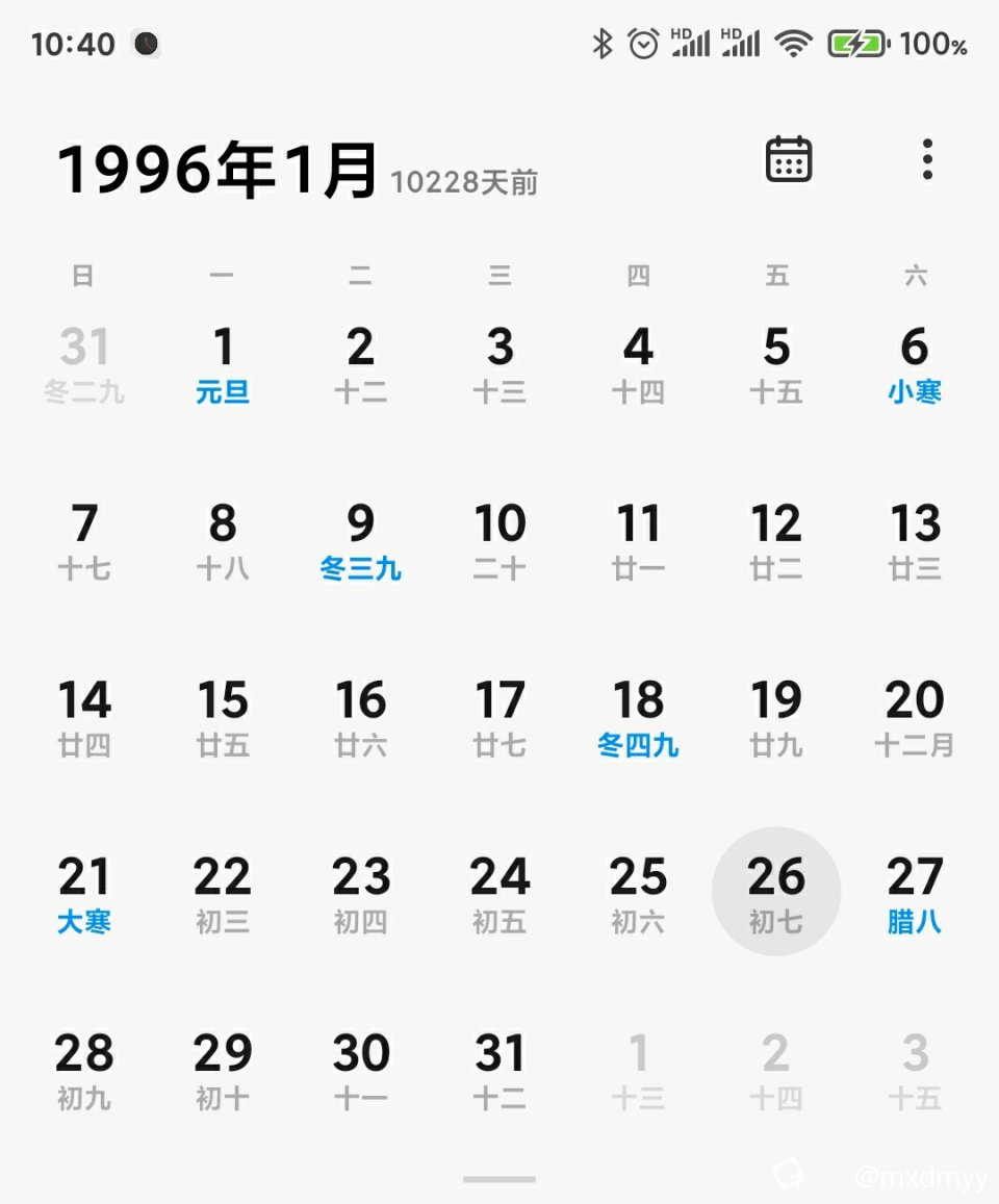 不一样,1996年1月26日是农历十二月初七,而2024年1月26日是农历十二月十六不晓得你的日历从何而来