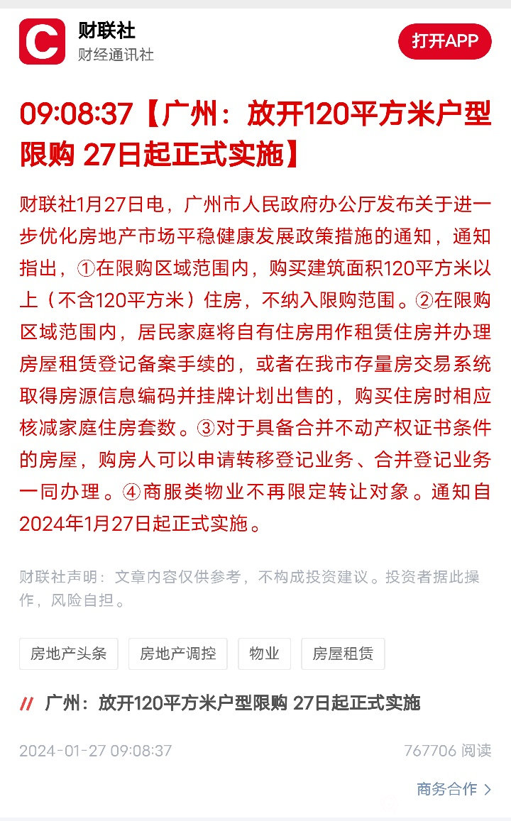 从今天(2024年1月27日)开始,广州放开120平以上住房限购。