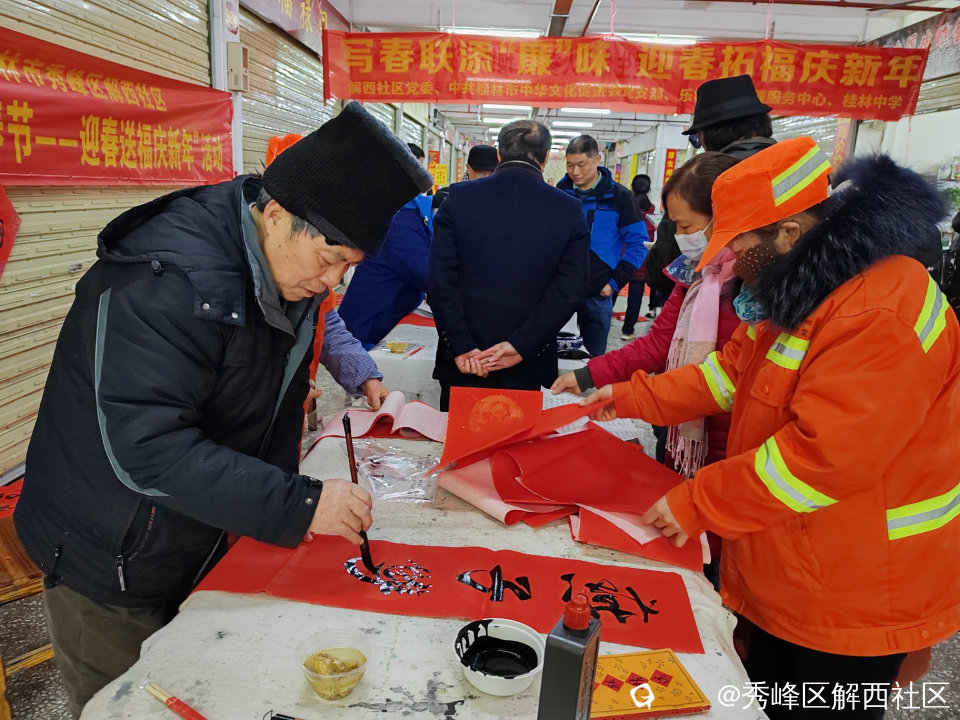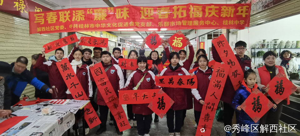 1月25日上午,秀峰区秀峰街道解西社区党委携手党建共建单位桂林市文化促进会、乐群市场管理中心和桂林中学共同开展“写春联添“廉”味 迎春拓福庆新年”活动,以服务“一老一小”带动提升千家万户的获得感、幸福感、安全感,把浓浓的年味和新春祝福送给社区居民。