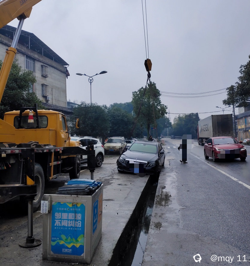 道路湿滑,梦见度低,车镜朦胧,一不小心就开进水沟了,这是临桂五通道路上的场景,大奔驰前轮入水沟。