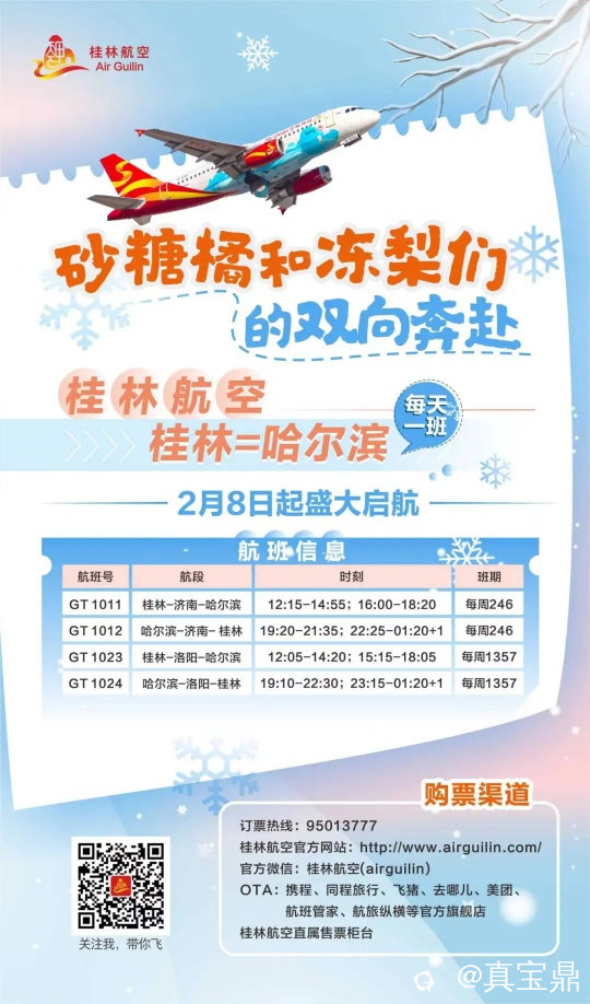 桂林航空将恢复桂林=济南=哈尔滨/桂林=洛阳=哈尔滨航线,每天一班。2月8日起执行。春节假期一起去看雪吧~