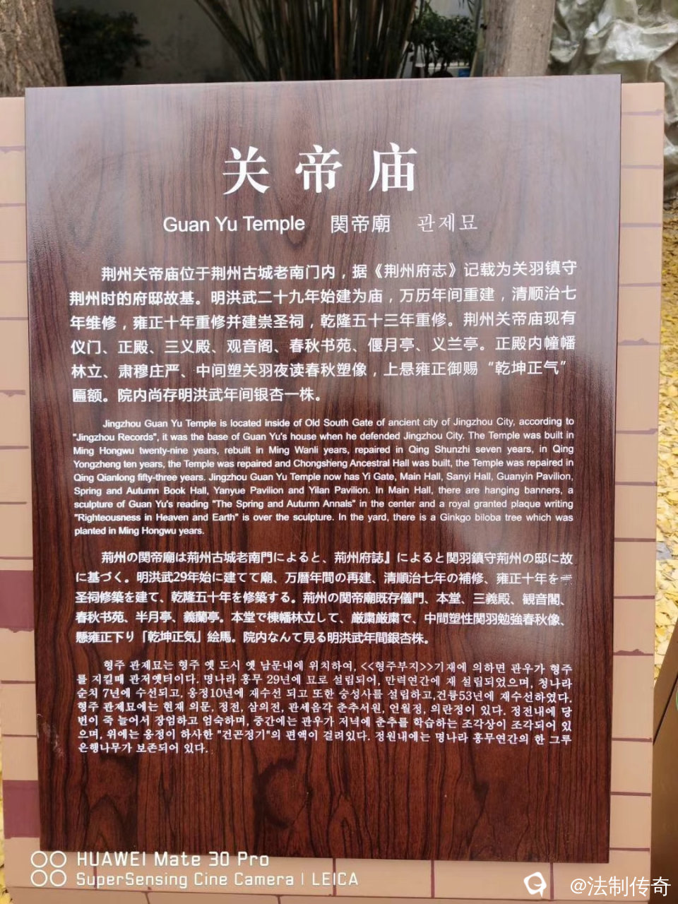 荆州关帝庙,也称关公庙,亦称关公馆。始建于明洪武二十九年,明万历时重建,清顺治七年、雍正十年两次重修并扩建。关庙旧址既是关羽镇守荆州10余年的府邸故基,也是关羽后代世袭江陵的地方所在。