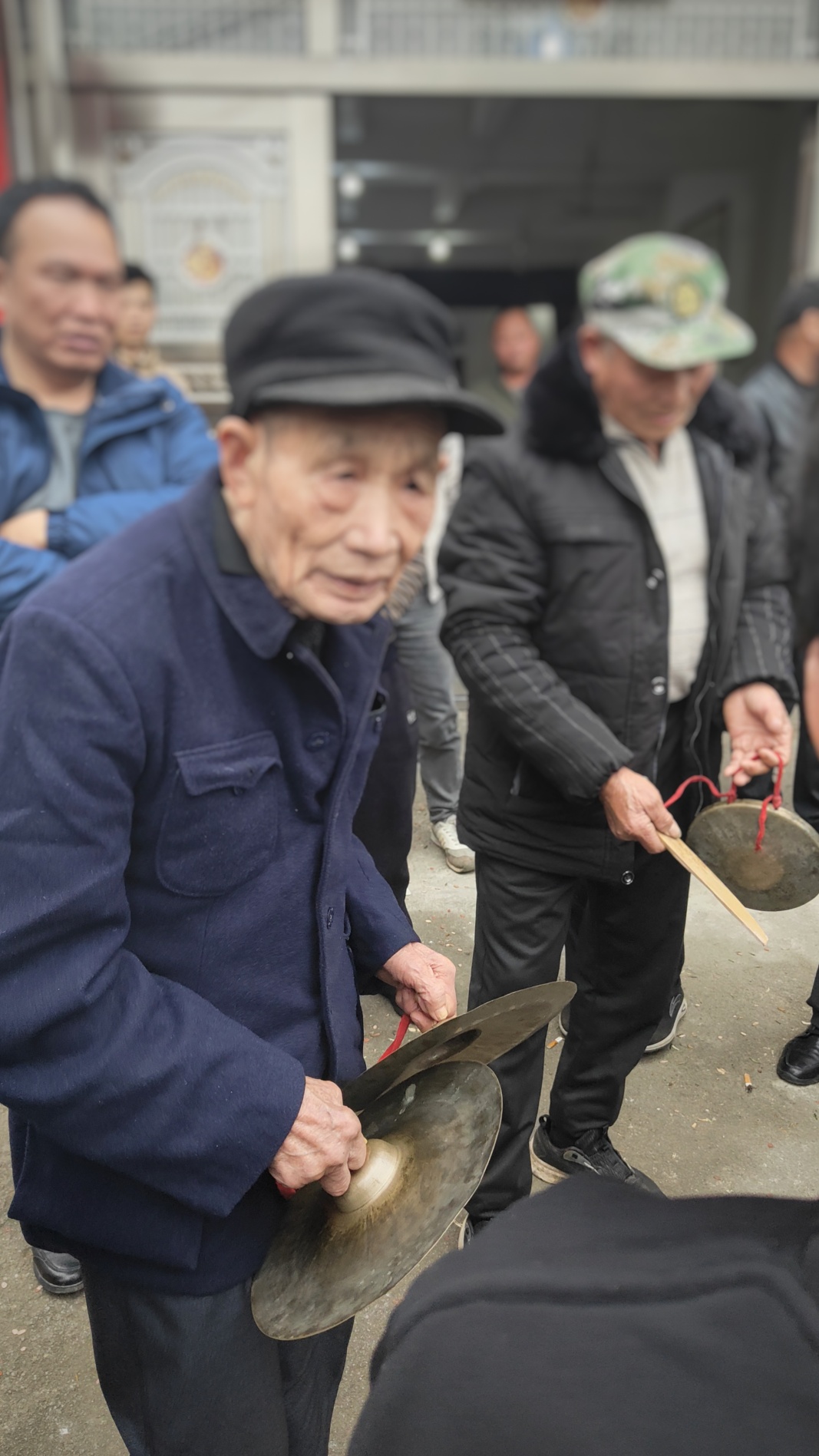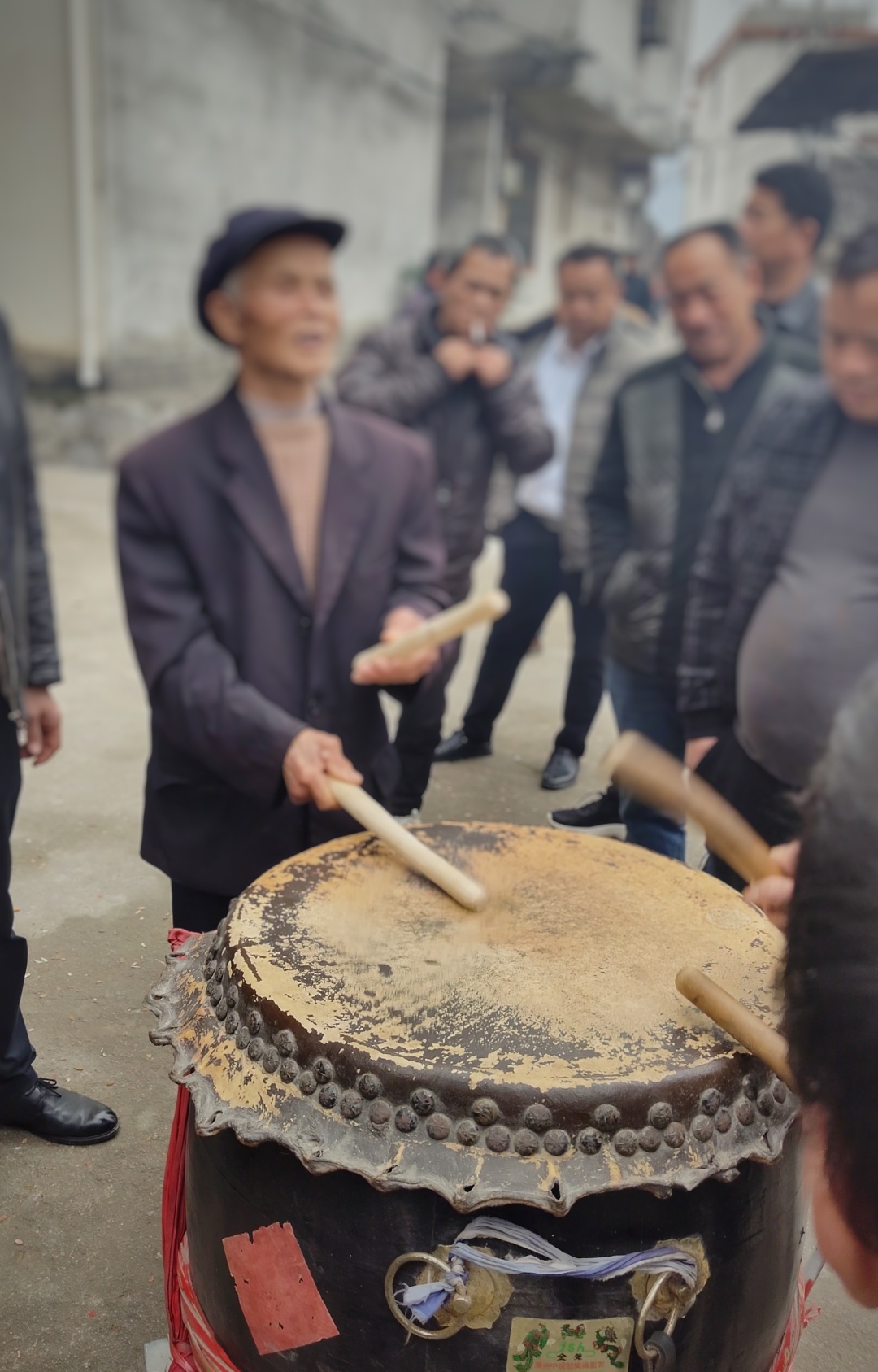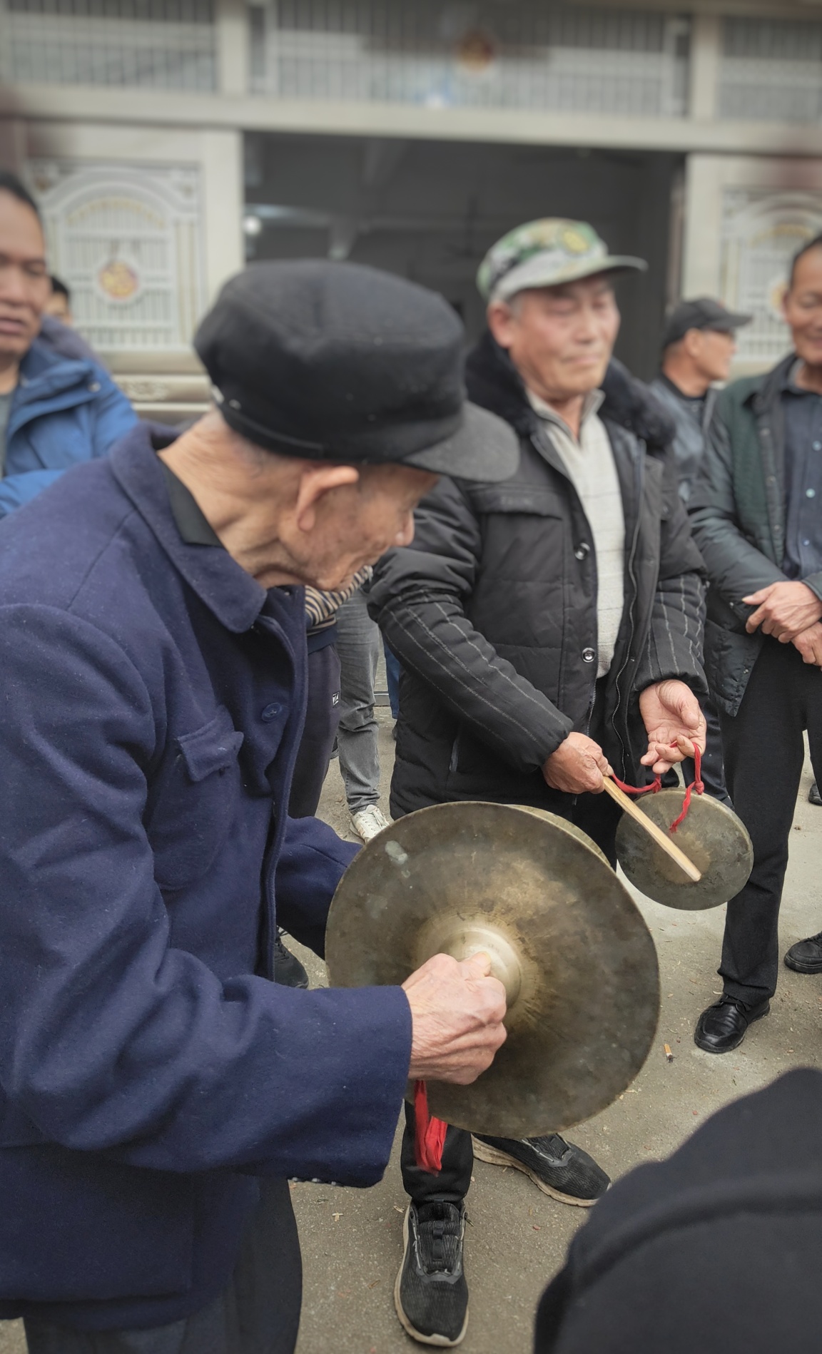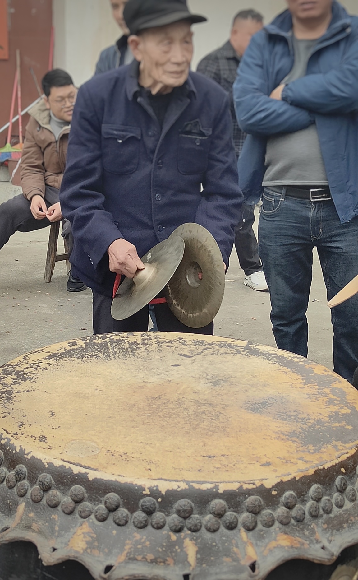 人群中,有一个大皮鼓、一个大铜锣、一个小铜锣,还有一个铜钹(镲)。要想将这些打击乐器有效的整合在一起也是有门道和技巧的。回想过往曾表演过三句半,也曾用过类似的打击乐器,但与这样的氛围感相比,敲打节奏还是的蛮大区别。