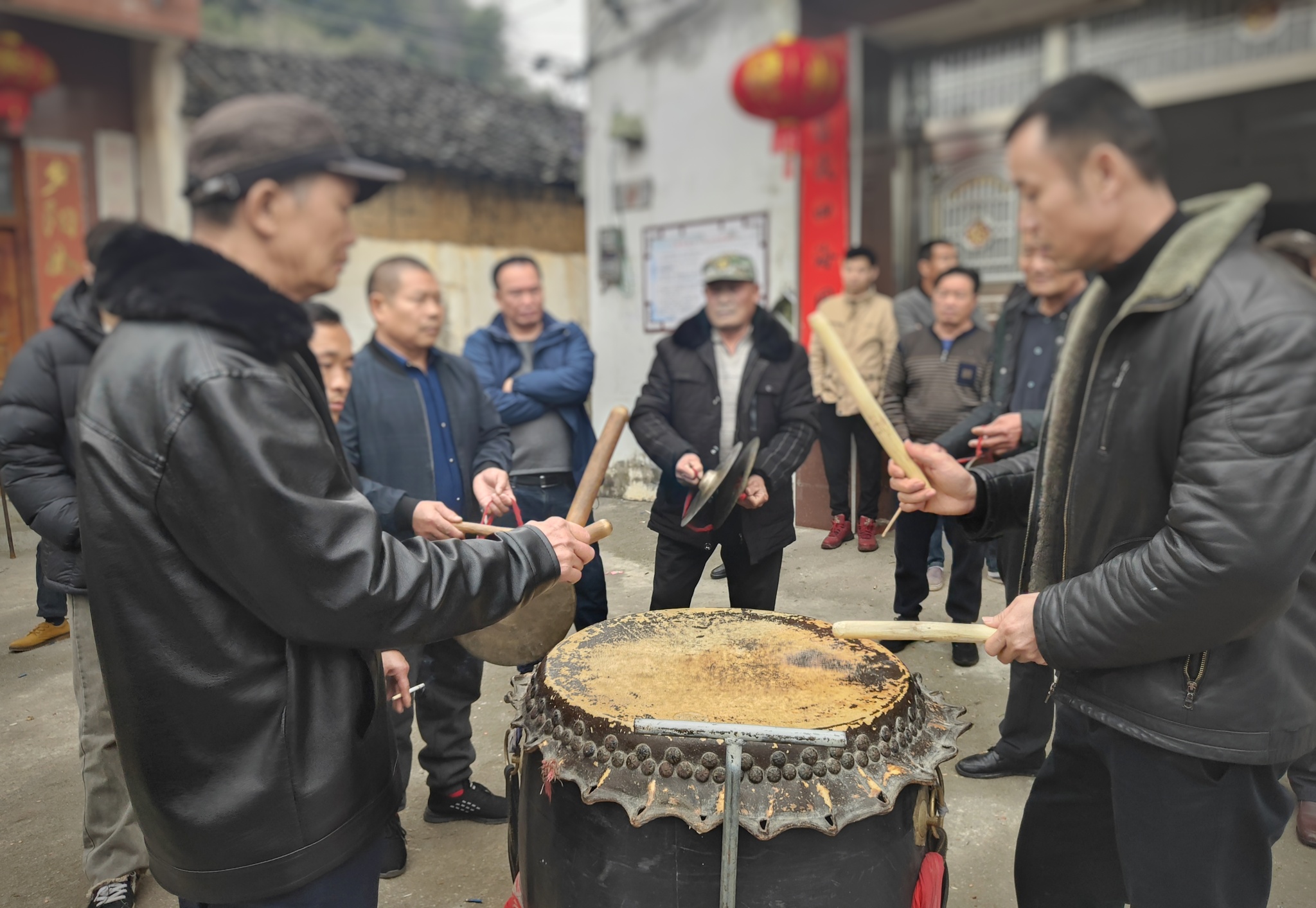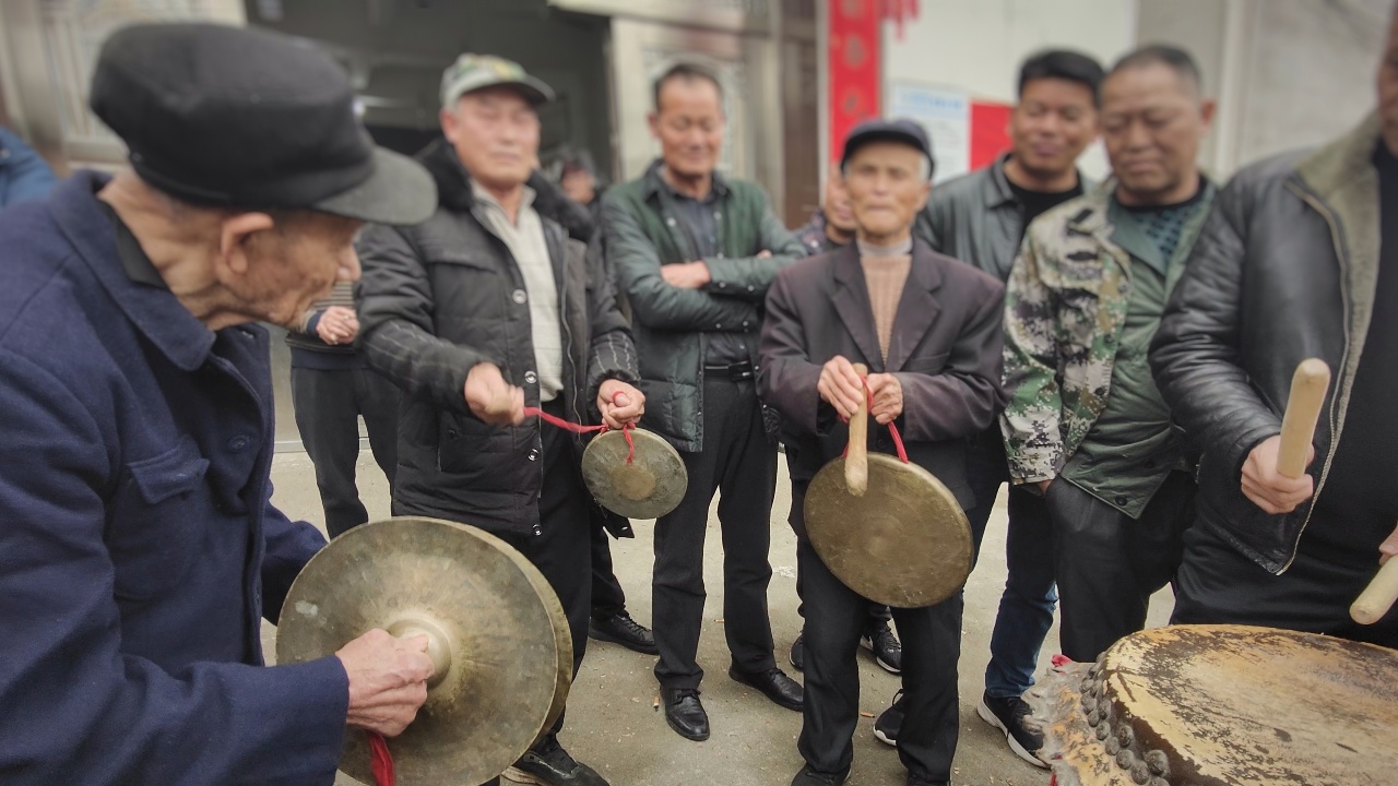 大年中,家乡舞龙灯,回去凑热闹。远远的就听到村中传来敲锣打鼓的声音(重大节庆活动迎接宾朋都会敲锣打鼓),于是前往村中文化室,原来是老辈们在现场教授晚辈如何敲锣打鼓。
