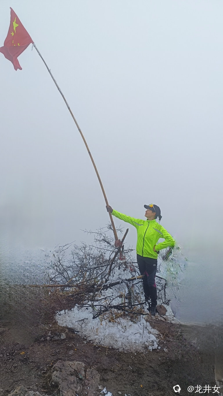到达北峰顶,站在红旗下