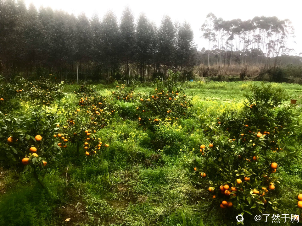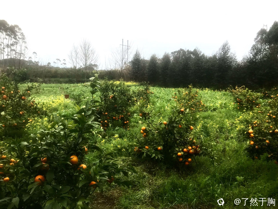 初春时节,因为今年柑橘销售不如人意,因而田园就具有了不一样的景象。荒地上开出了各种各样的野花,色彩斑斓。果园中橙色的柑橘与金黄的油菜花相互映衬,既是果园又是花园。田园间小桥流水,花黄草青,情调别致。