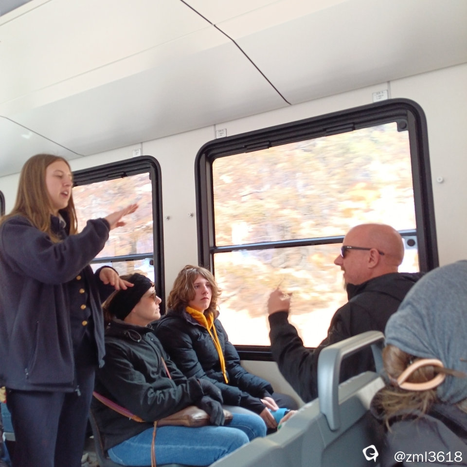 返程快结束时,列车员来车厢与乘客交流,感谢乘客对她工作的赞美和到派克峰观光。