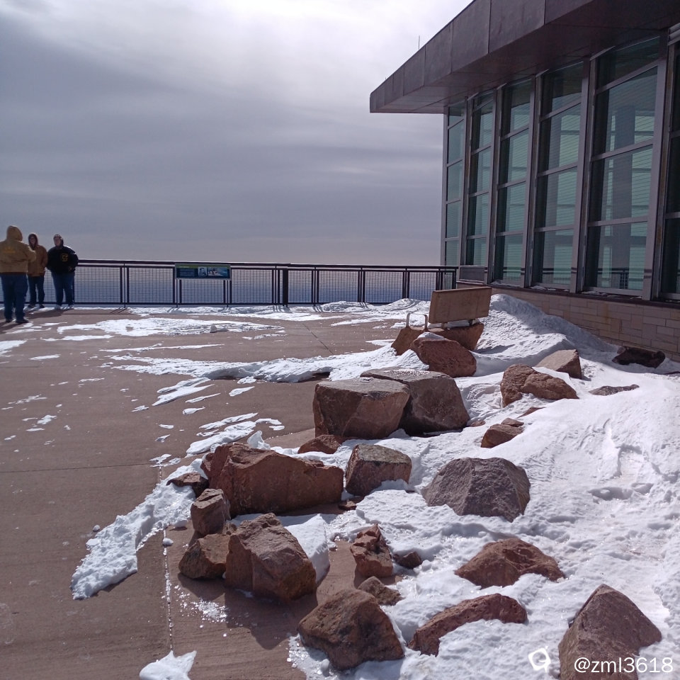 出发前,我做足了功课,防寒衣服鞋帽,全副武装,但仍感觉到极其寒冷,也被眼前的情景所震撼。山顶狂风肆掠,抬眼望去尽是被风吹雪粉碎分化的花岗岩碎石,据说山顶的风速可达每小时130英里,人在观景台几乎站不稳,4300的海拔让人喘不过气来,有人缺氧,在观景台呕吐。头回看到风吹雪如此可怕,好在这时没下大雪,太阳穿过云层,把雪山照得发亮。