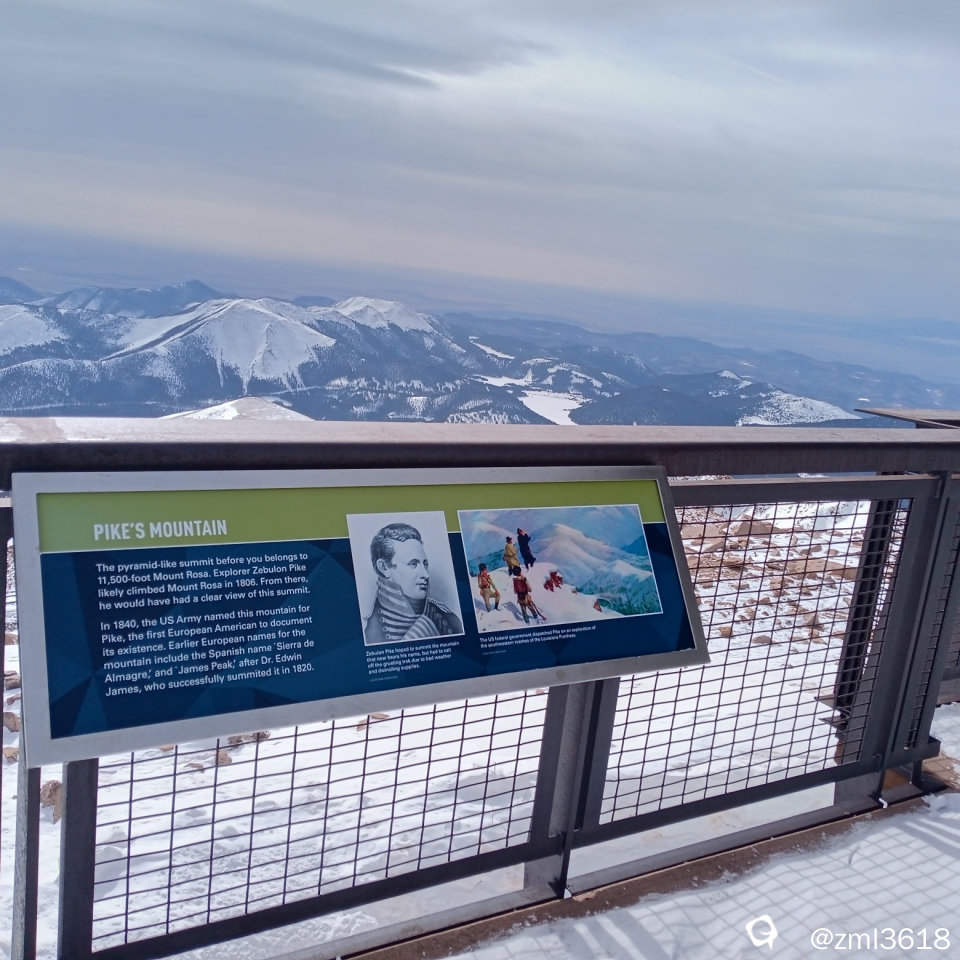 这块牌是为纪念介绍派克先生而立,他是第一个登上落基山的人,此山以他而命名。