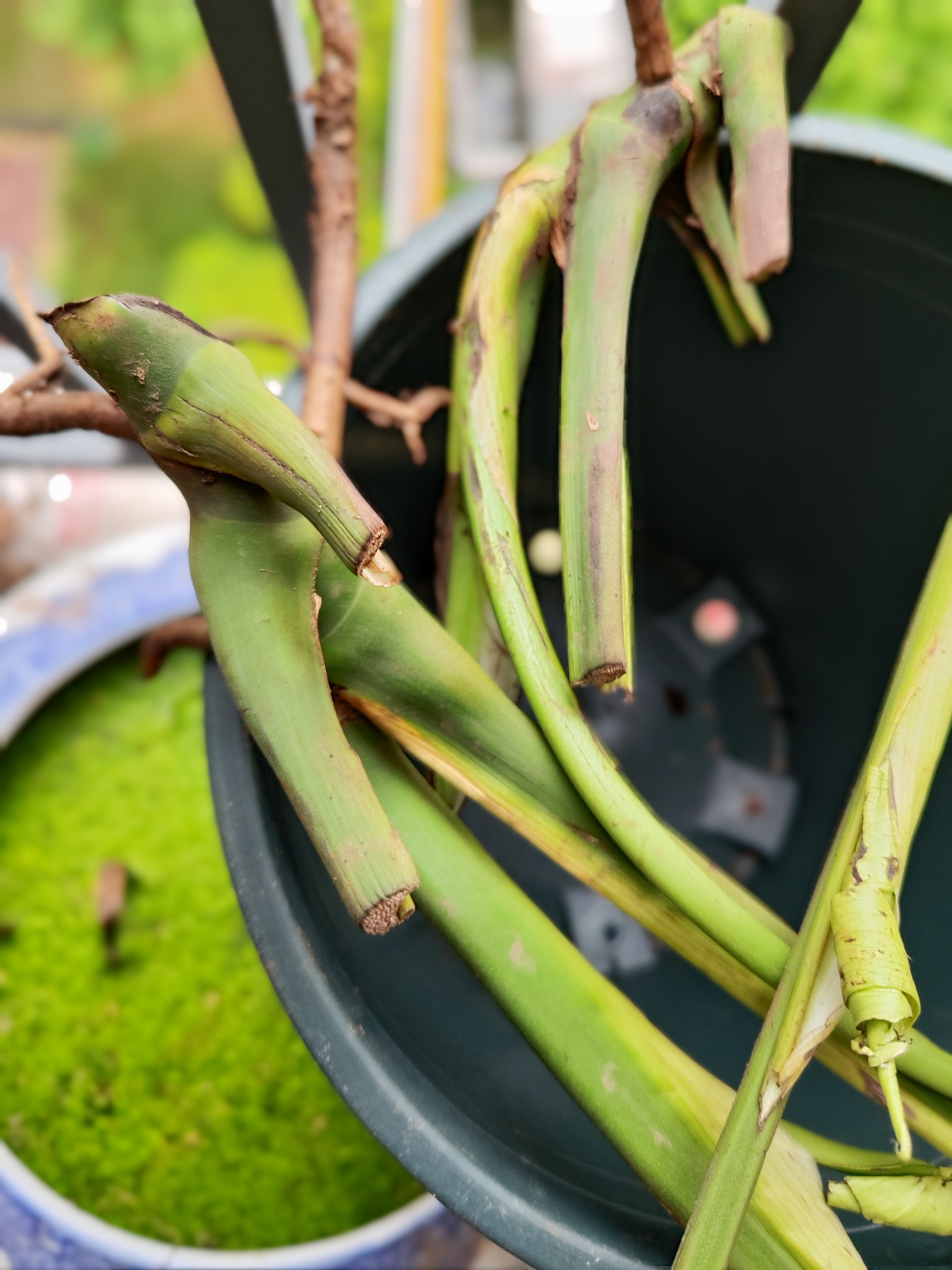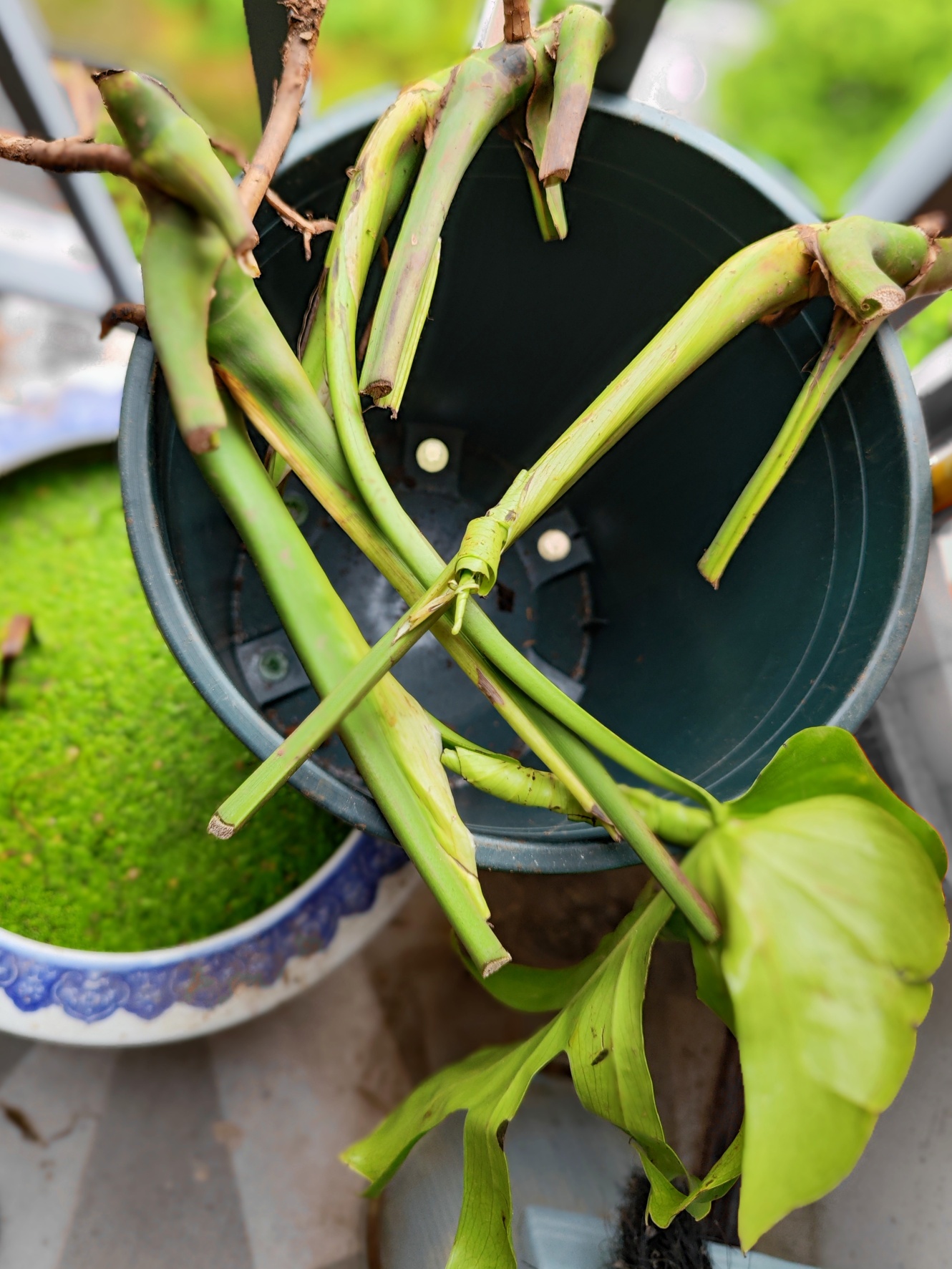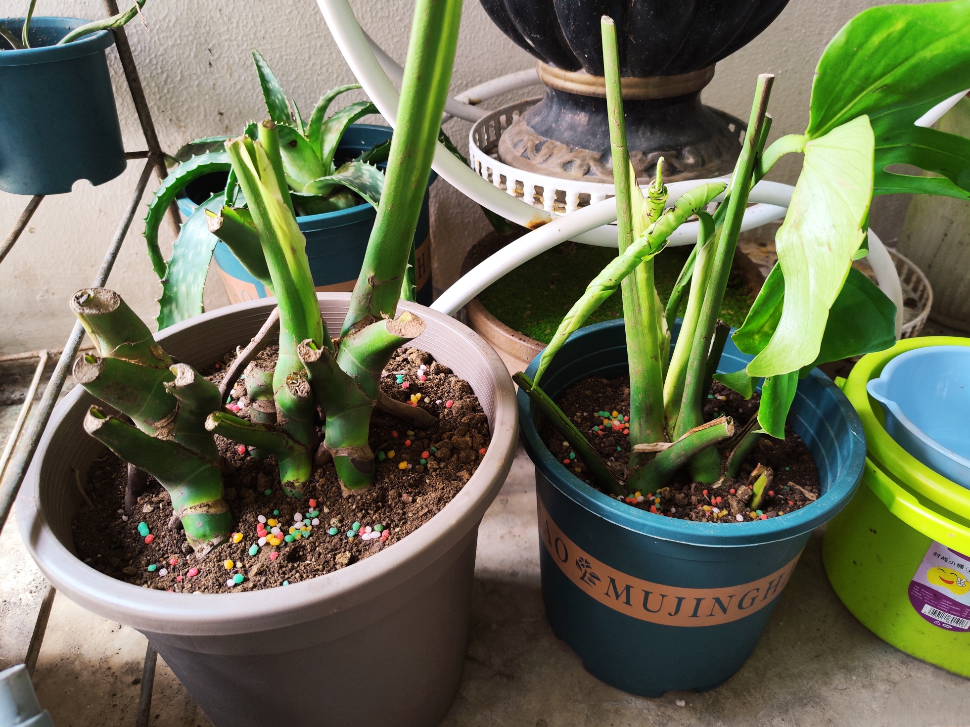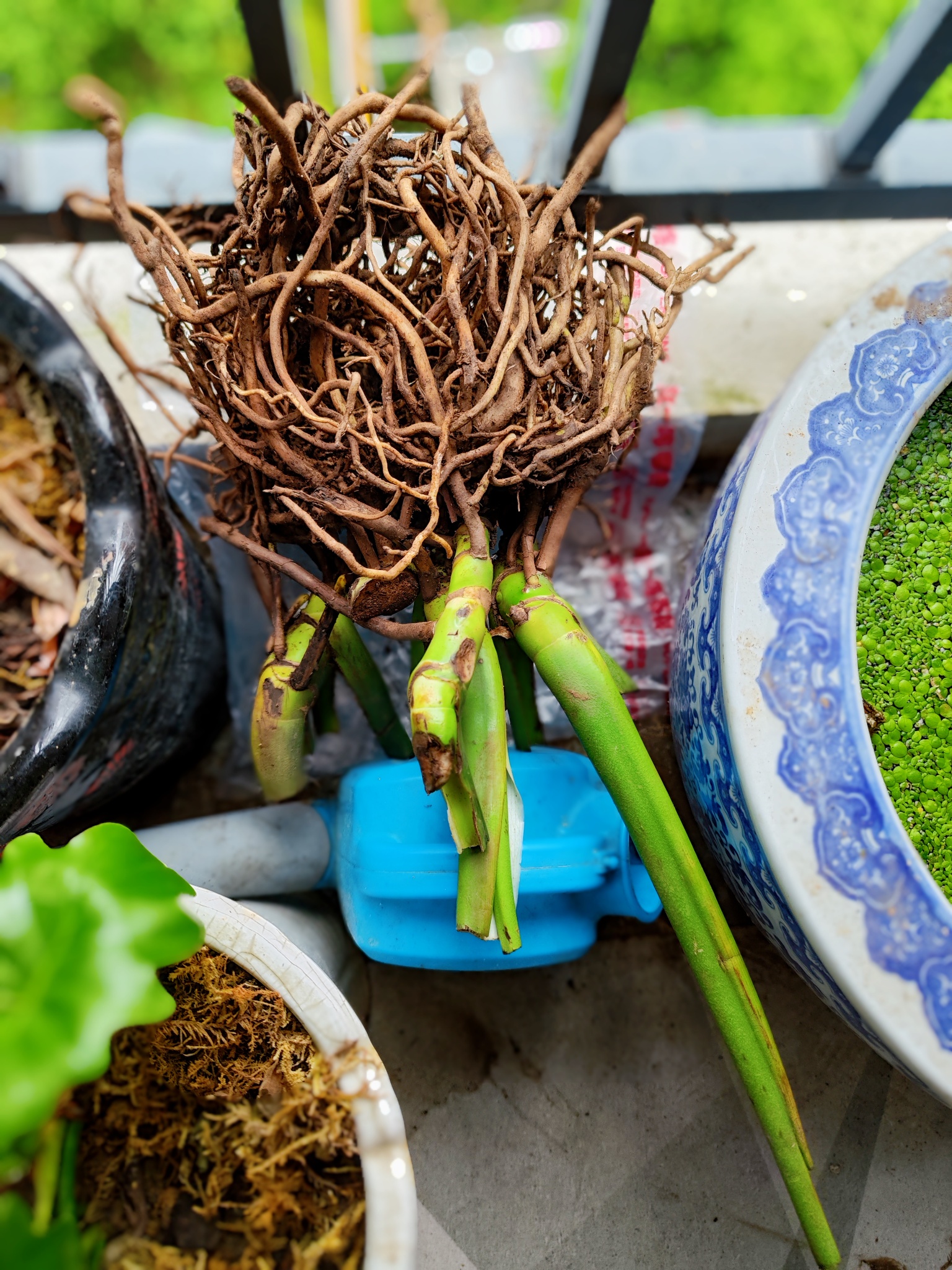 学习盆栽种植有一段时间了,我悟出来一个道理:植物也有生命力,栽种后能成活的就是想活的,不成活的就是对生活失去了信心,眼前这几棵被嫌弃的枯焦叶片龟背竹看起来根系还蛮旺盛,晓不得生命力怎么样,拿来抢救一下看看能否有救。