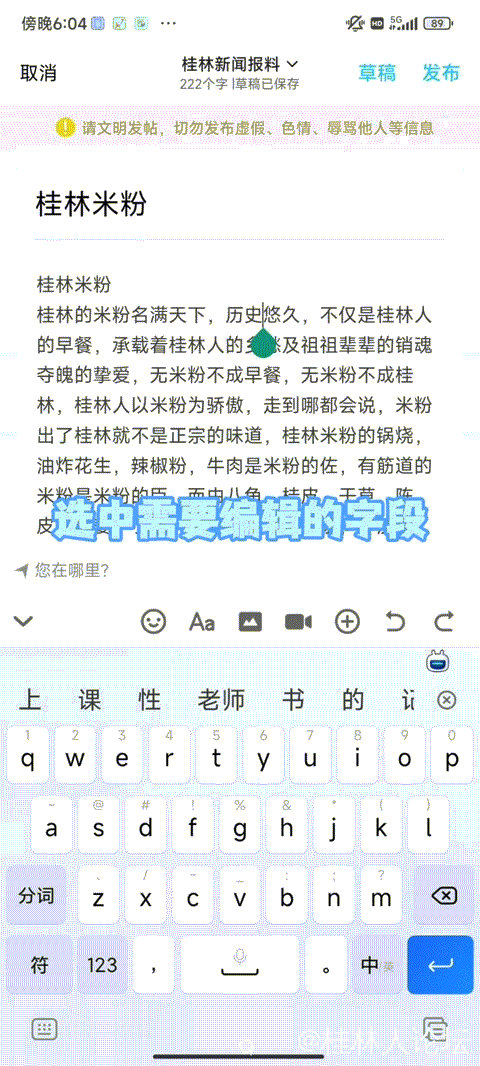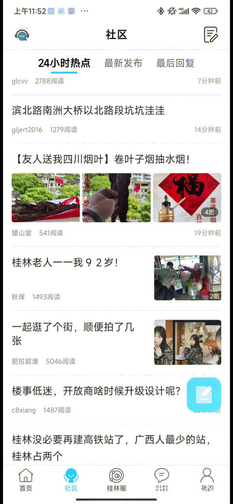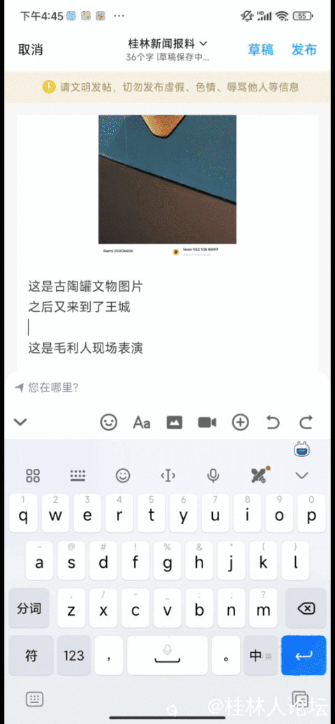 在首页点击发帖有奖图标,或者底部栏点击“论坛”或“桂林圈”图标,进入后点击右下方蓝色的发布图标,即可进入编写内容界面,编写完后点击发布即可。