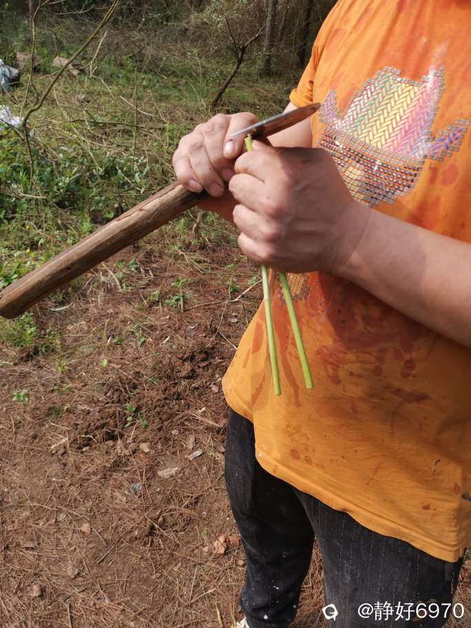 这时发现我身边除了手机和拐杖,其他什么东西都没有,再就是我又累又渴,御厨当时为了减轻我的负担,把吃的喝的都背在他身上,刚扯的笋子我也带不走,没有东西装,只好给他们打电话。哎,要命哦,山里信号差,无网络,根本打不出去,真的是欲哭无泪,有点绝望的感觉,不过我已经走到竹林,估计他们就在附近,不会走远,于是我又往前走,边走边喊他们,估计他们走到竹林里面去了,听不见,我只好又返回到放笋子的地方,怕过路的人把我的笋子捡走了,这时换个手机再试一试,这时有微弱的信号,接通了,很快御厨就走出来接我来到原来野炊的空地上,他交代我就坐在原地剥笋子,他继续进竹林扯笋子。