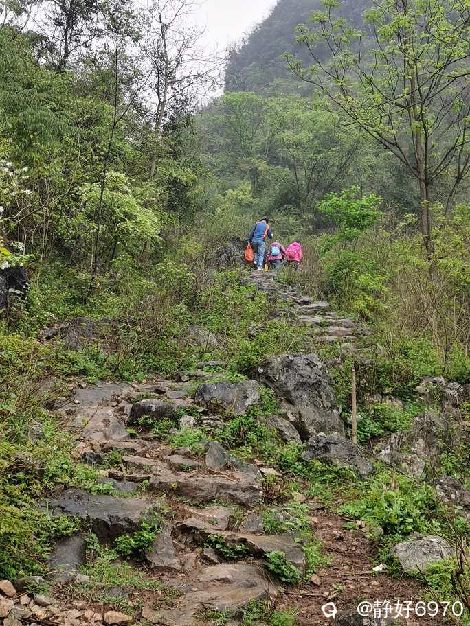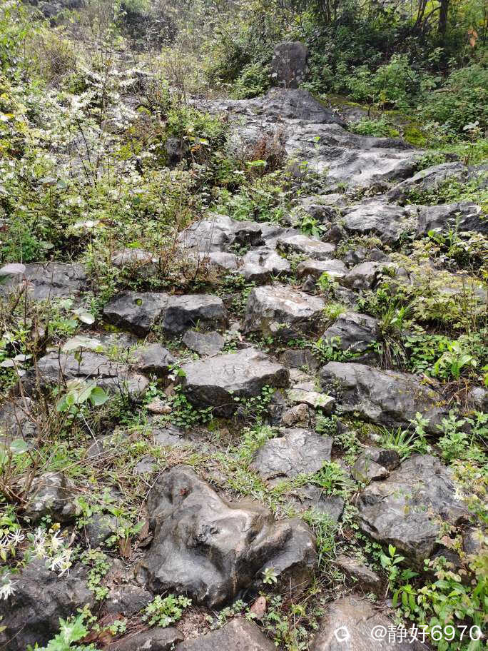 很快就要开始爬山啦。还好不是我想象中的全是荆棘的土山,而是修葺的很好的石头路,也就是以前的茶马古道,一路上还有牛羊经过,在古代,这样的路算是官道。因为下了雨,石头路变得很滑,为了保险起见,上山前,每个人都备了一根自制的拐杖。由于我体力不行,很快我就掉队了,走在最后,不过不影响我游玩的心情,我边走边拍照,当然还要紧跟那爷孙俩,因为我不认识路,怕迷路,只要抬头能看见他俩在前方就不怕了。