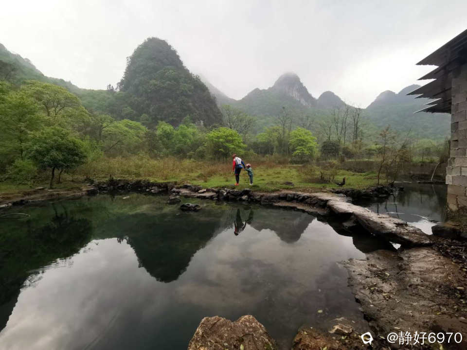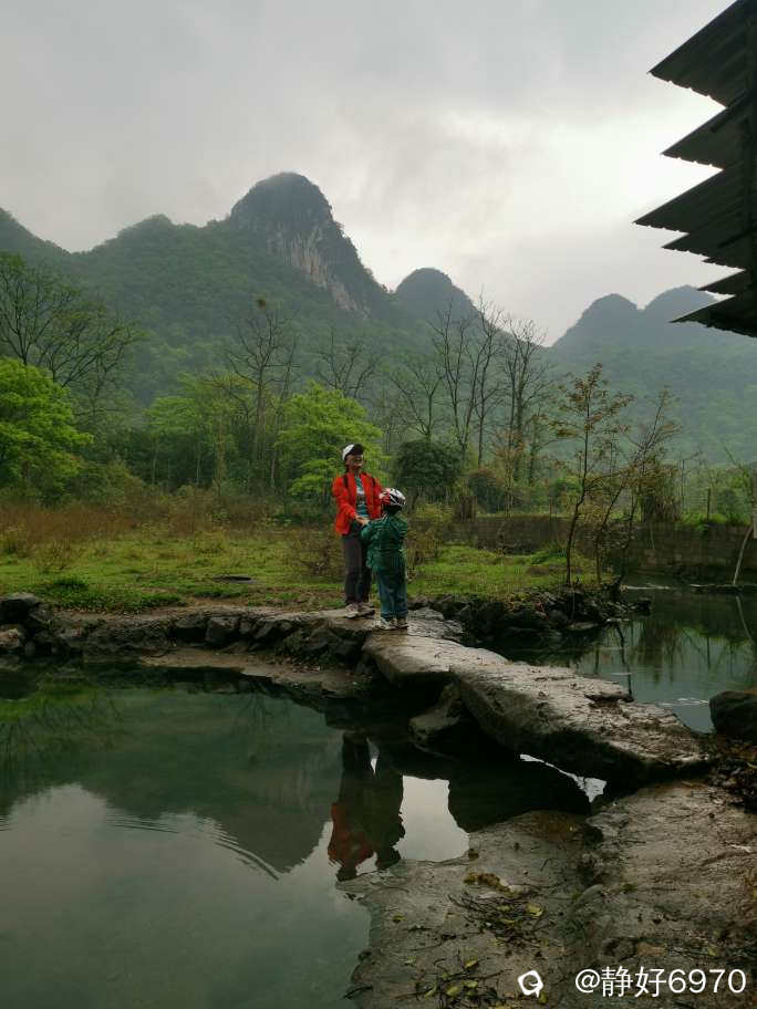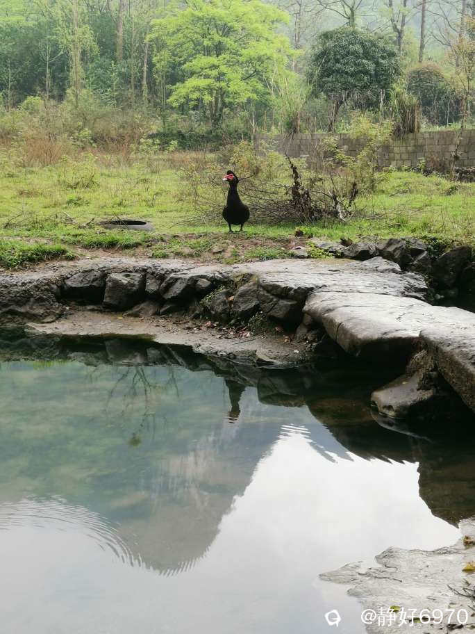 这也太早了吧,我们刚到,他们已经下山了。趁着御厨他们去停车的功夫,我跟小朋友在上山路口玩起来,因为这里的风景很美,放眼望去。有清清的泉水,有石板桥,还有一只黑色的洋鸭慢悠悠的在草地漫步,远处有峰峦叠嶂的石山,下雨之后,雾气朦朦,好像给远处的山披上了一层淡淡的纱,若隐若现,增加了朦胧感。