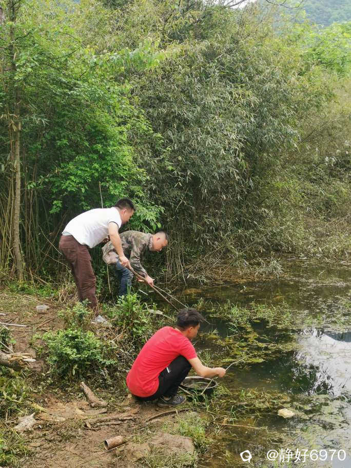 大约一个小时左右,御厨扯了几袋子(生活网的布袋)出来,我说够了,别去扯啦,这么多到时出去还要爬山,拿不动。这时已经是中午一点多,我们也饿了,就坐在地上吃着带来的面包和粽子,这时来了几个三四十岁左右的小伙子,在旁边的水塘钓鱼,鱼竿都是现场制作,用就地的竹子做的,盆是在附近捡的,很快就钓了很多的泥鳅和小鱼仔,再利用原来别人野炊挖的“土灶”。锅是捡来的盆,水是水塘边的泉水,鱼是刚钓的,他们只带了几陀米粉和盐巴,筷子也是就地取材,用镰刀砍的树枝做的(图五)。