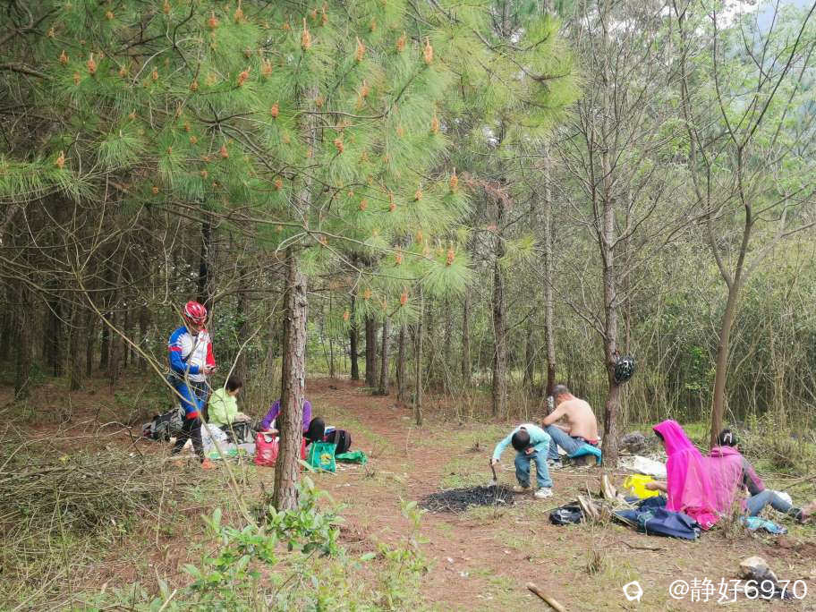 下雨后骑车感觉凉兮兮的,还好带了一件外套,很快骑友就到了,我问御厨,有多远?他说他也不知道,跟着大部队走呗。我说上次骑车时你们不是去过一次,他回答,你不知道我路痴吗?去过一次哪就知道怎么走?由于不知道具体地方,我索性闭着眼睛睡觉,到了自然会叫我起来。大约又骑了半个多小时,七拐八拐的,有一段路是烂泥巴路,很滑,避免摔个嘴啃泥,还是下来走路,又是我跟爷孙骑友快速走到上山路口,刚到路口,就看见两个挑着麻袋,拄着拐杖的帅哥下山,这是我们碰到的第一波扯笋子下山之人。