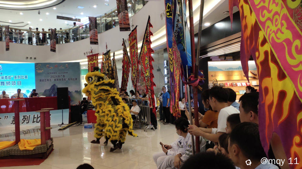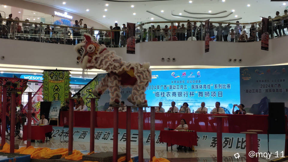 19日晚,12支舞狮表演队,在桂林临桂万达广场内的舞台进行了精彩的“狮王争霸”“狮王上高山”的竞技表演。