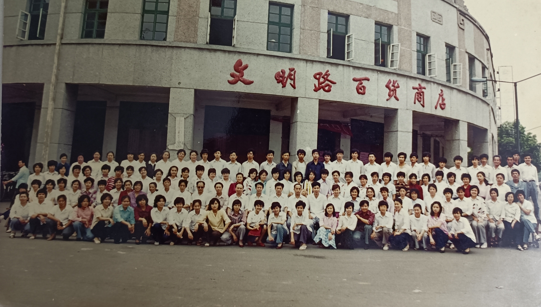 1986年6月8月,桂林市文明路百货商店全体干部职工在门前合影留念。(刘庚新提供)