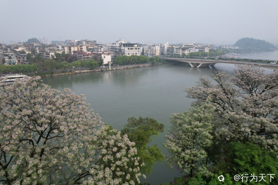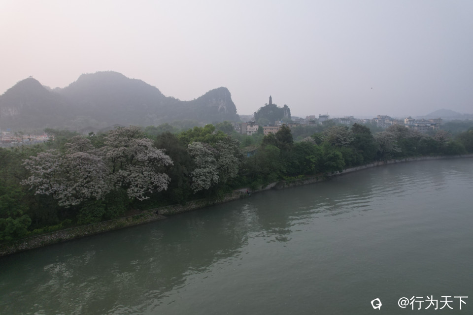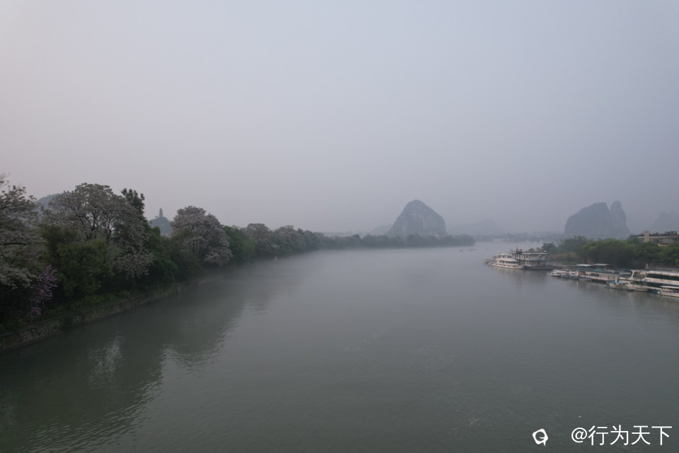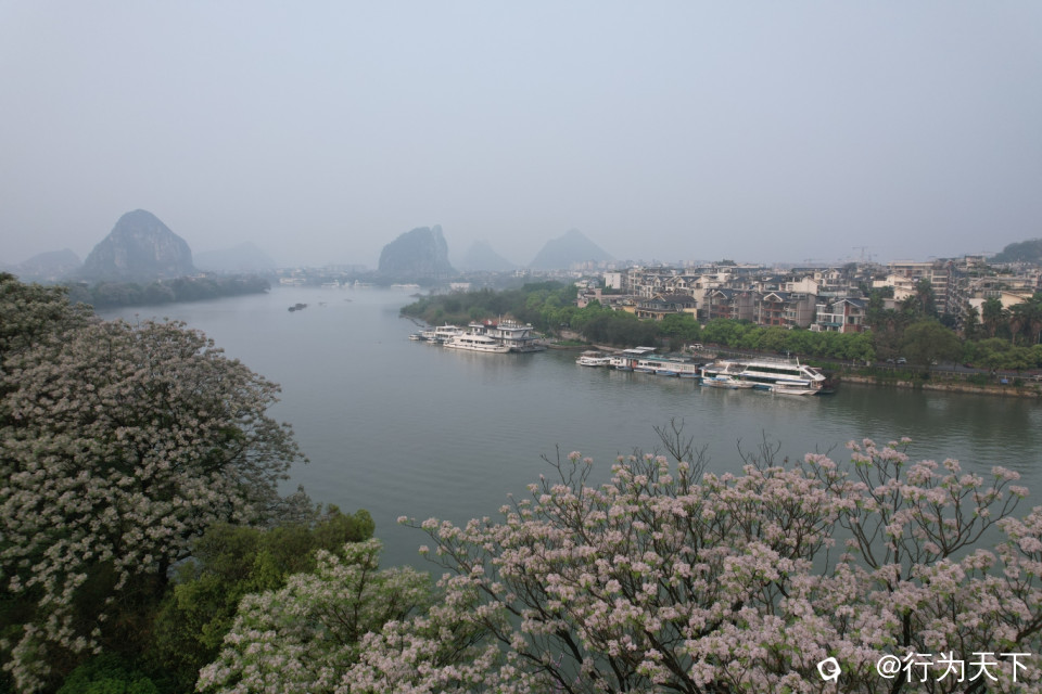 桂林山水,漓江仙境,濛濛烟雨桂林城,叠翠奇峰碧水盈,浓淡相宜呈画卷,春江百里伴歌行。春暖花开,漓江两岸的苦楝树早已开出白色的小花,随风艳舞,娇艳妩媚。沿着桂林市区段,漓江由上而下,江上的每一座桥都是最佳观景台。