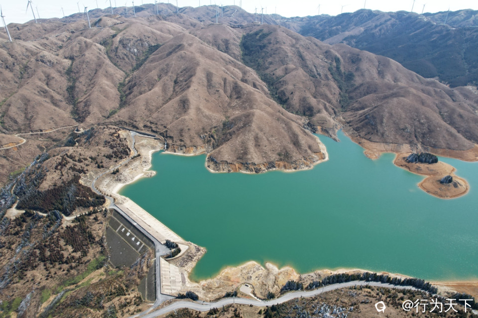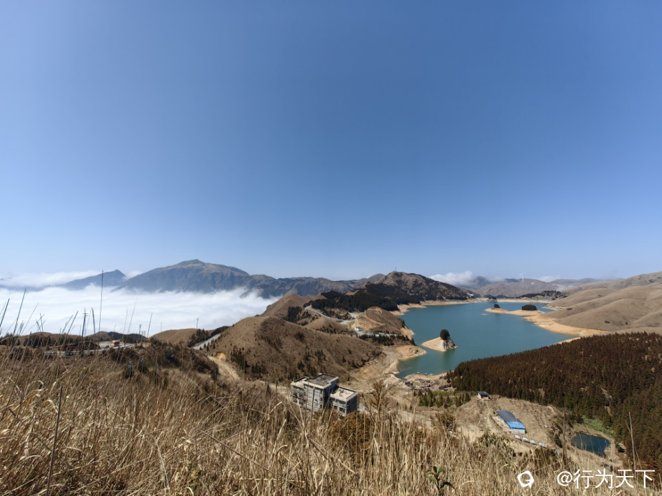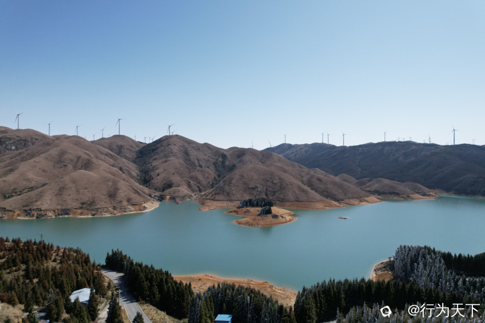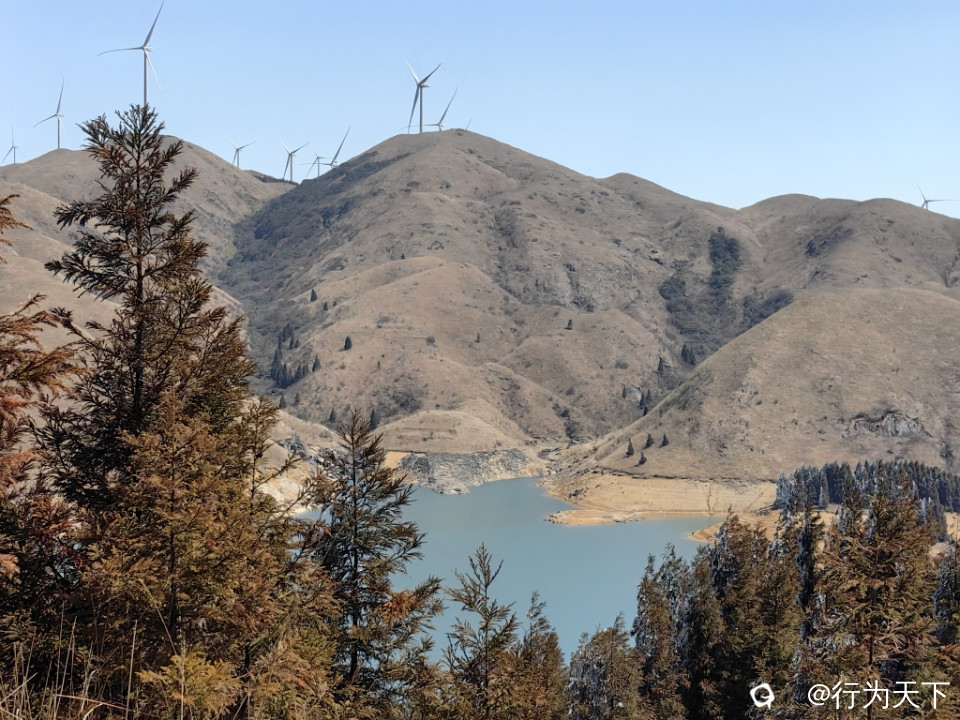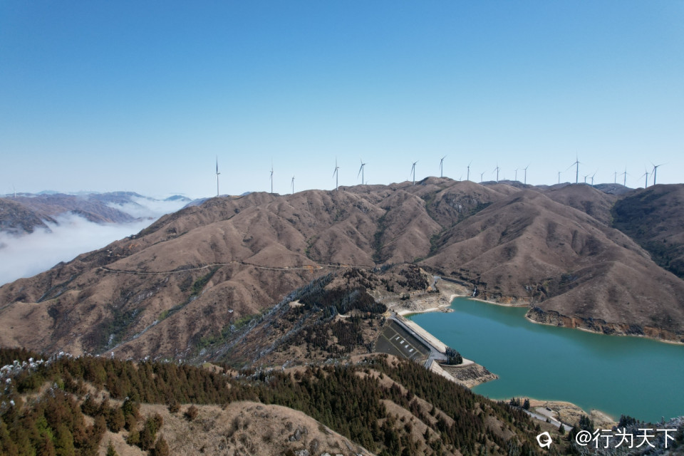 此时的天湖水库上空,一片蔚蓝,山的那边还是一汪云海,另一边则是发黄的草甸,似乎在期待春天到来,又将是绿油油一片。远处的风车在徐徐转动,如一座座在飞翔的螺旋机车,与另一座山头的发射塔对视着,像是守卫天湖的勇士,坚守在天湖之巅。