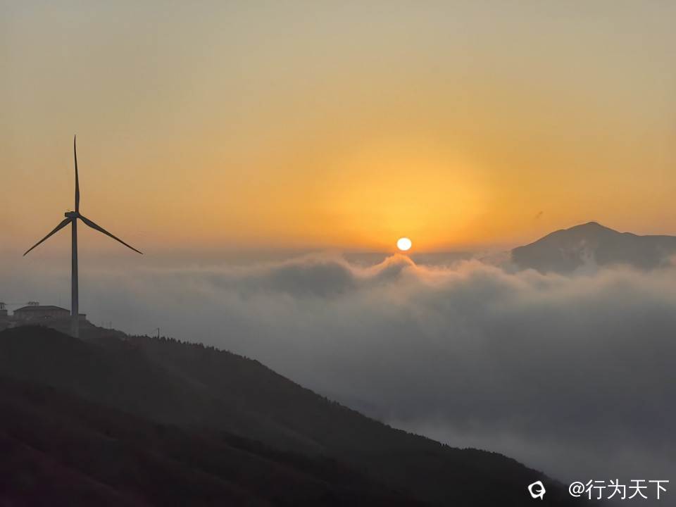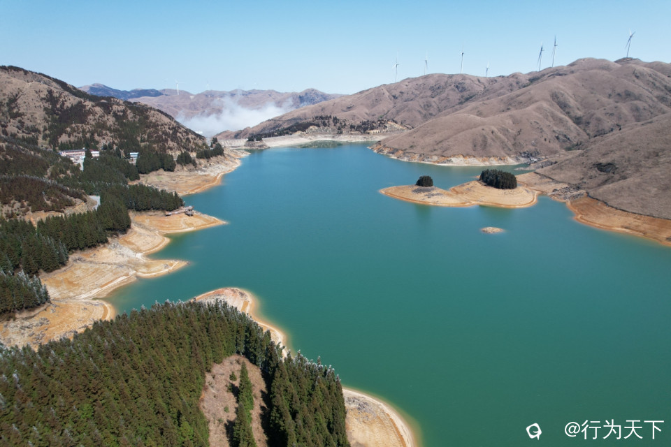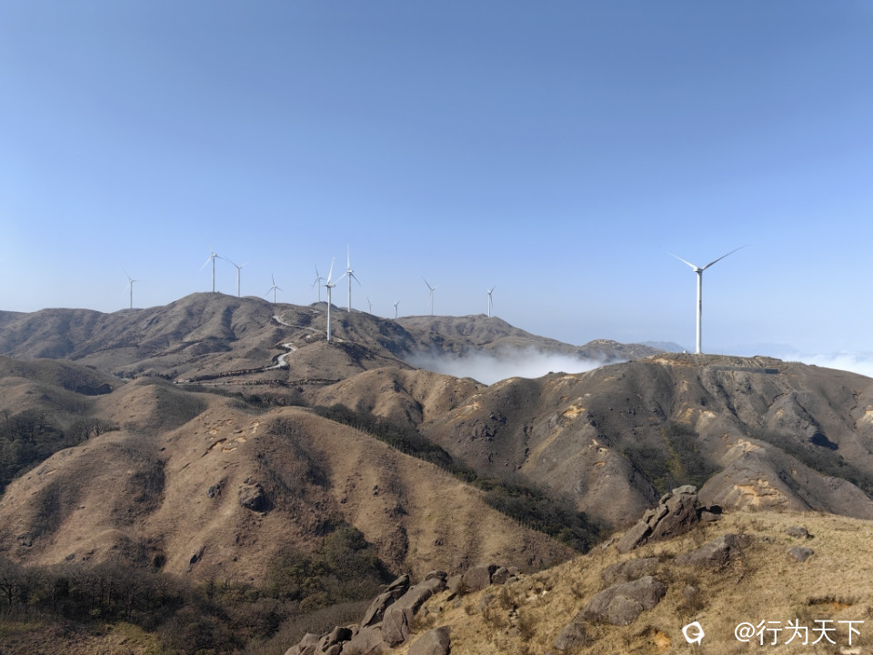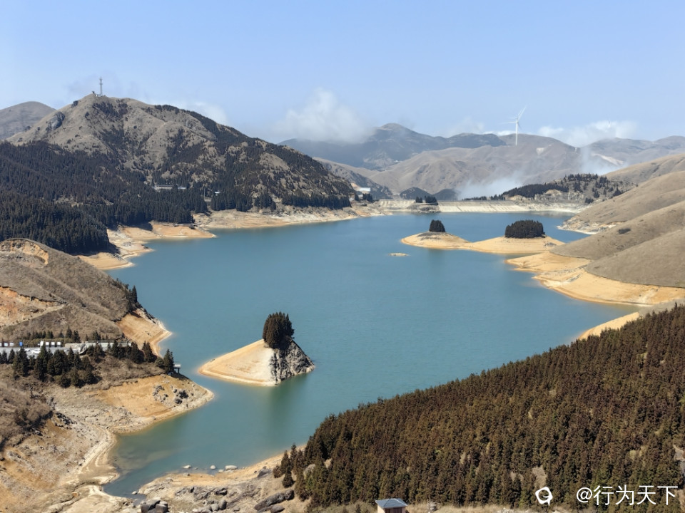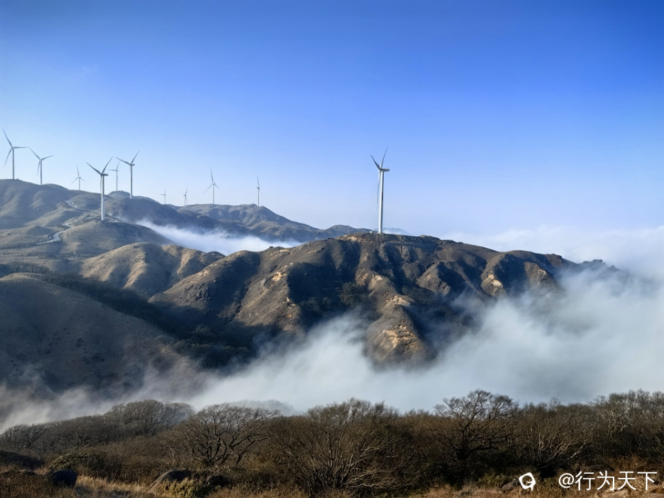 此时的天湖水库上空,一片蔚蓝,山的那边还是一汪云海,另一边则是发黄的草甸,似乎在期待春天到来,又将是绿油油一片。远处的风车在徐徐转动,如一座座在飞翔的螺旋机车,与另一座山头的发射塔对视着,像是守卫天湖的勇士,坚守在天湖之巅。