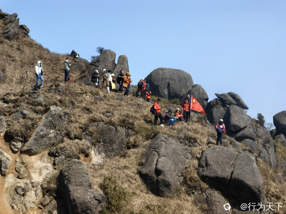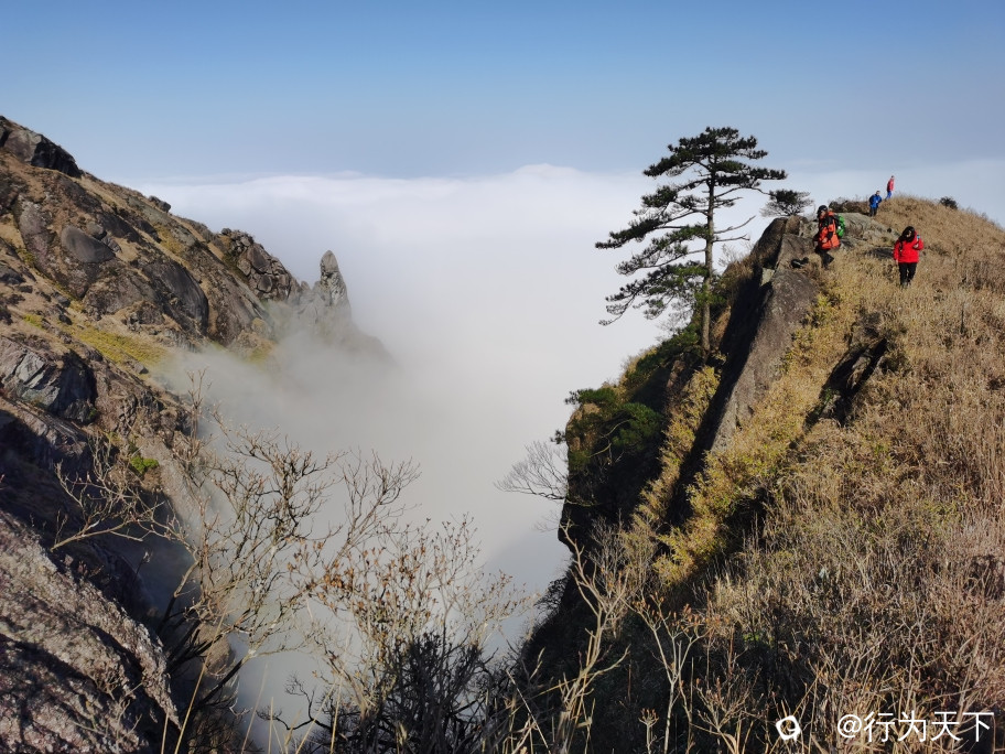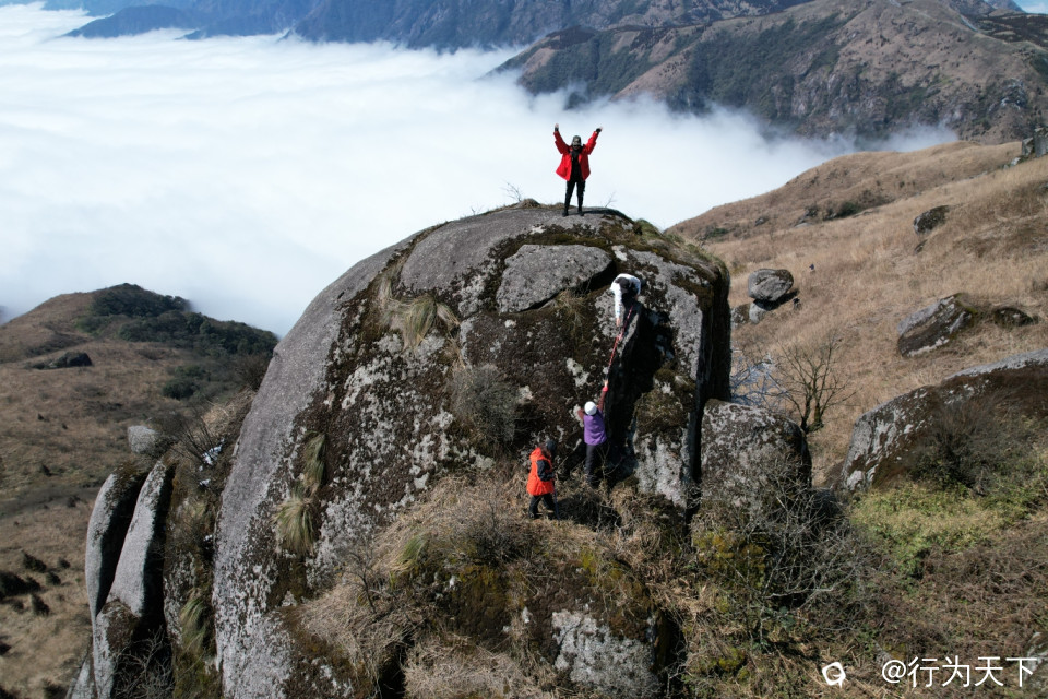 没走多久,就听到前面的群友又开始欢呼起来,原来云海又在山崖上再次出现,而旁边的怪石堆也成功地引起大伙的兴趣,好动的群友早已爬上怪石,手舞足蹈的摆拍起来。也有些群友一个劲的往山崖上冲,想尽快坠入云海。