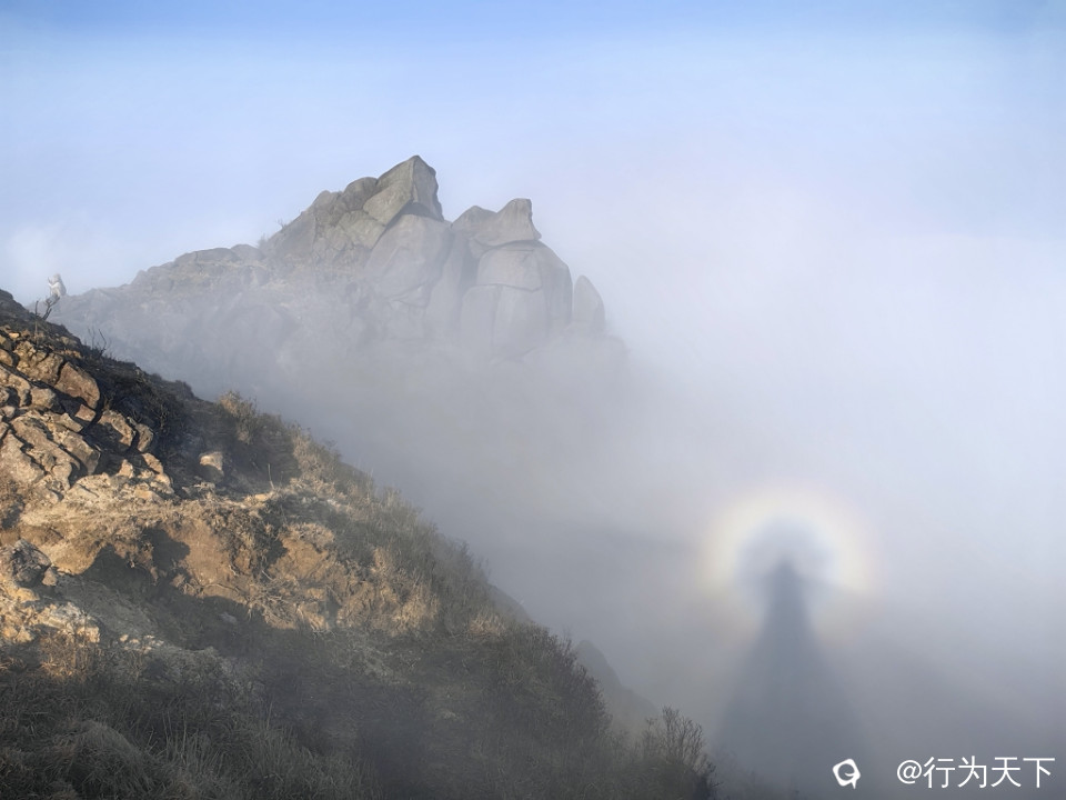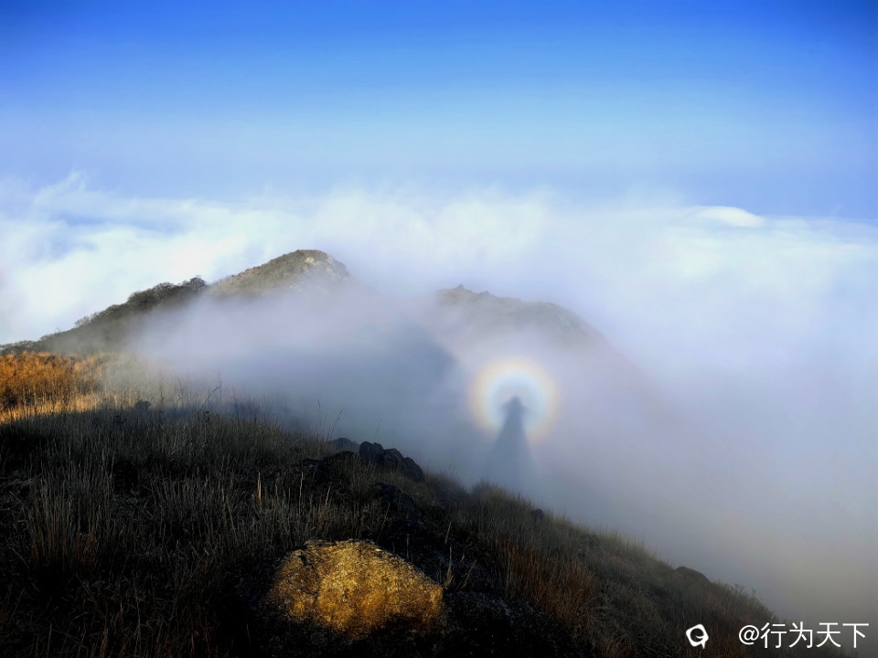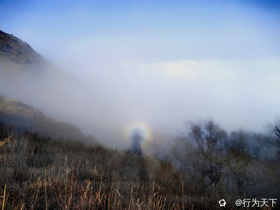 放眼望去,一片片轻纱般的薄云在半山谷游动,游到眼前的薄云里,果然呈现出彩色的光环,与彩虹的七色光谱无异,只是光环并不太大,里面站着一个人影。大家都欢呼起来,各自挥手,都说那光环里的影像是自己而不是别人。我仔细观察,那佛光中的确只有自己一人的身影,我挥左手,影舞左手,我举右手,影抬右手。一片薄云过去,佛光消失,另一片薄云飞来,佛光又显。反复多次,直至太阳下沉,斜射的角度有了变化,佛光才未再现。