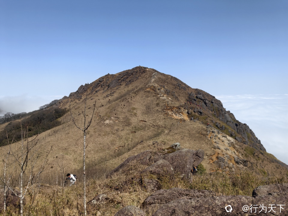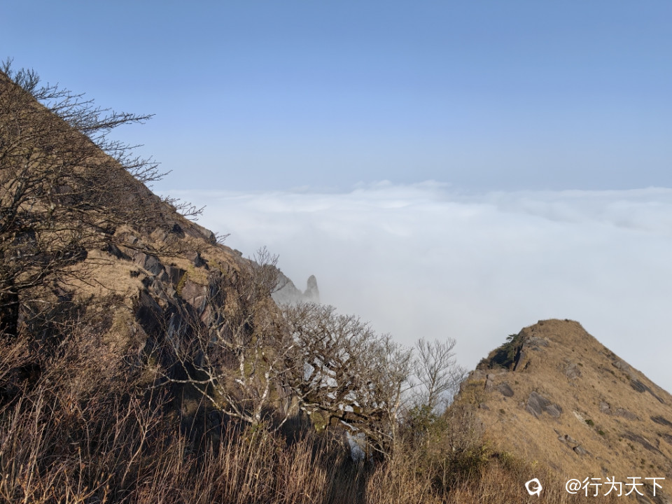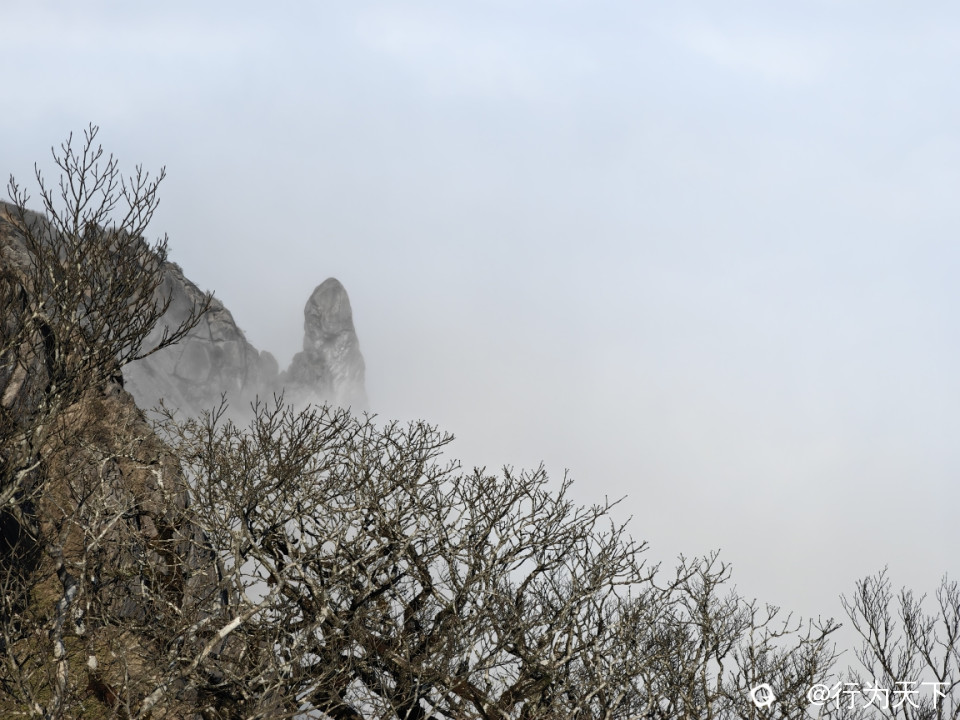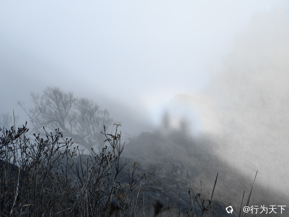 经勇哥提醒,说距离不远的峡谷悬崖处有一柱巨石,形似得道修仙的神仙,非常值得一看。话音刚落,我便和几个群友起身前往。目测悬崖处不远,实际上连走带滑,又有大雾遮挡视线,也足足走了10几分钟。