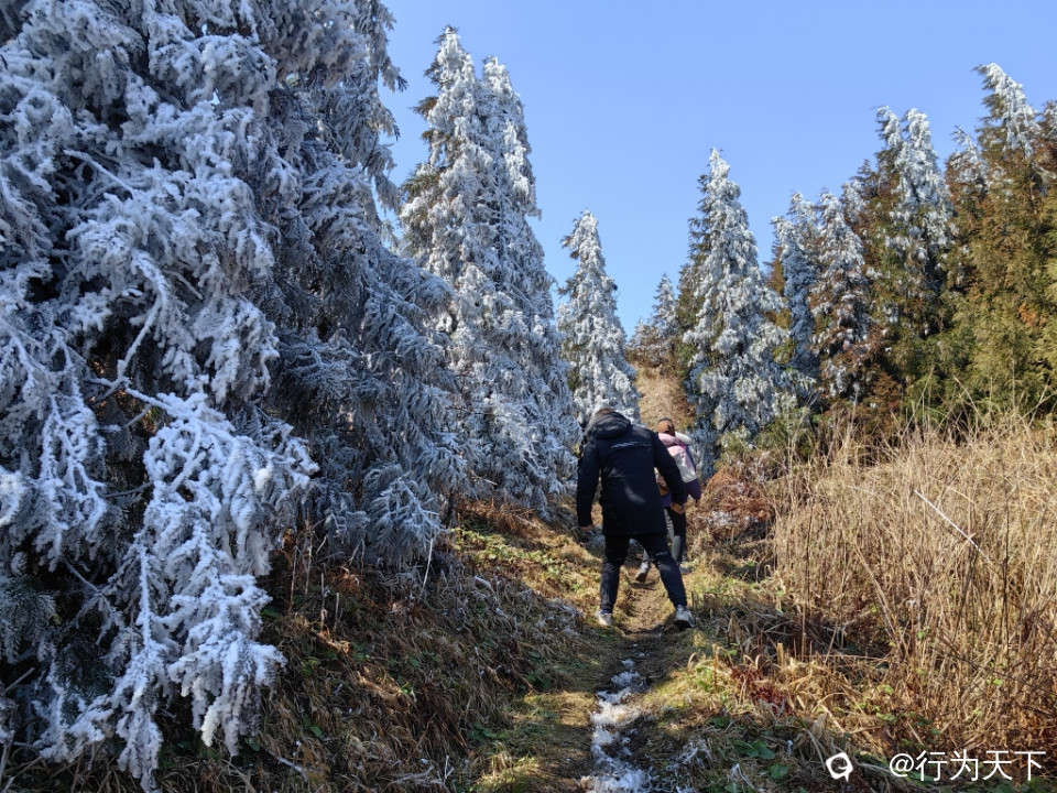 抬头只见漫山的冷杉挂满白霜,原来是雾凇还没有融尽,低垂的枝头,像是恭迎山外来客。雾凇在阳光的照耀下,变得晶莹剔透,瑰丽绝伦,淡淡的如仙境般的氛围,给山野披上了一层神秘的面纱。也不时有冰渣哗哗往下跌落,这是气温在慢慢回升,融雪的节奏。