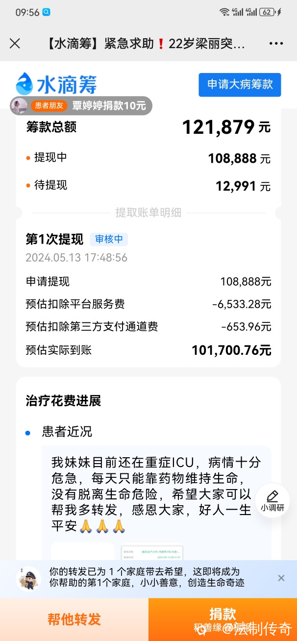 这个水滴筹真是喝人血,平台费要六个点,人家等着救命的钱,十万元就扣了六千!