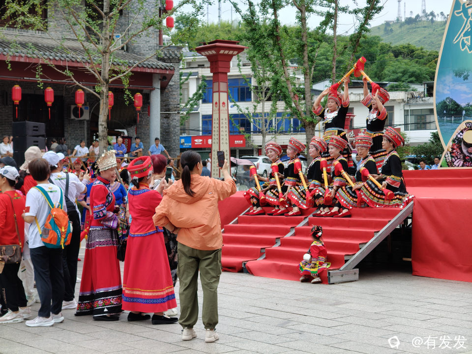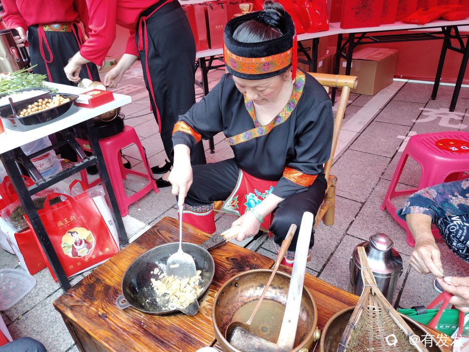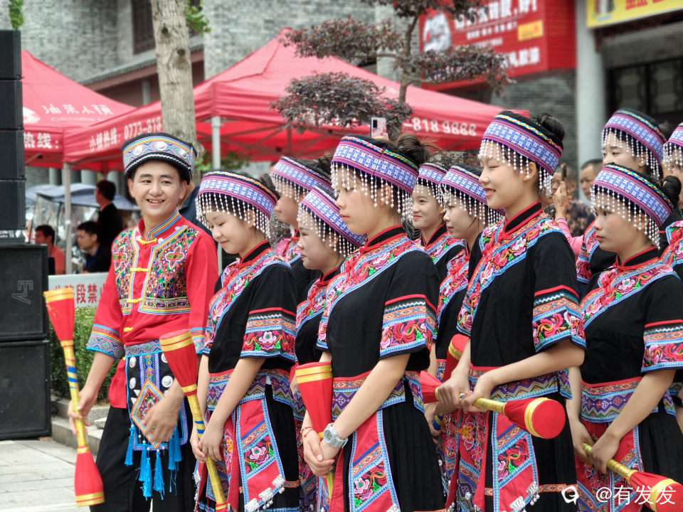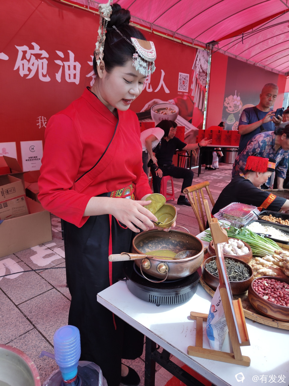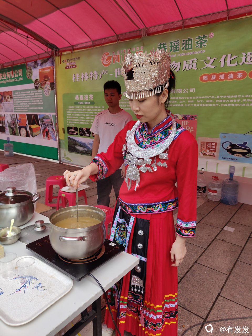 今天的恭城油茶小镇,都处都是穿着艳丽的各种少数民族服装的人群,也有穿汉服的。他们兴高釆烈,跳舞′,表演,打卡拍照,品 品尝油茶。买各种各样的糕点。热闹非凡。 整个工程小镇。成了一个欢乐的海洋。