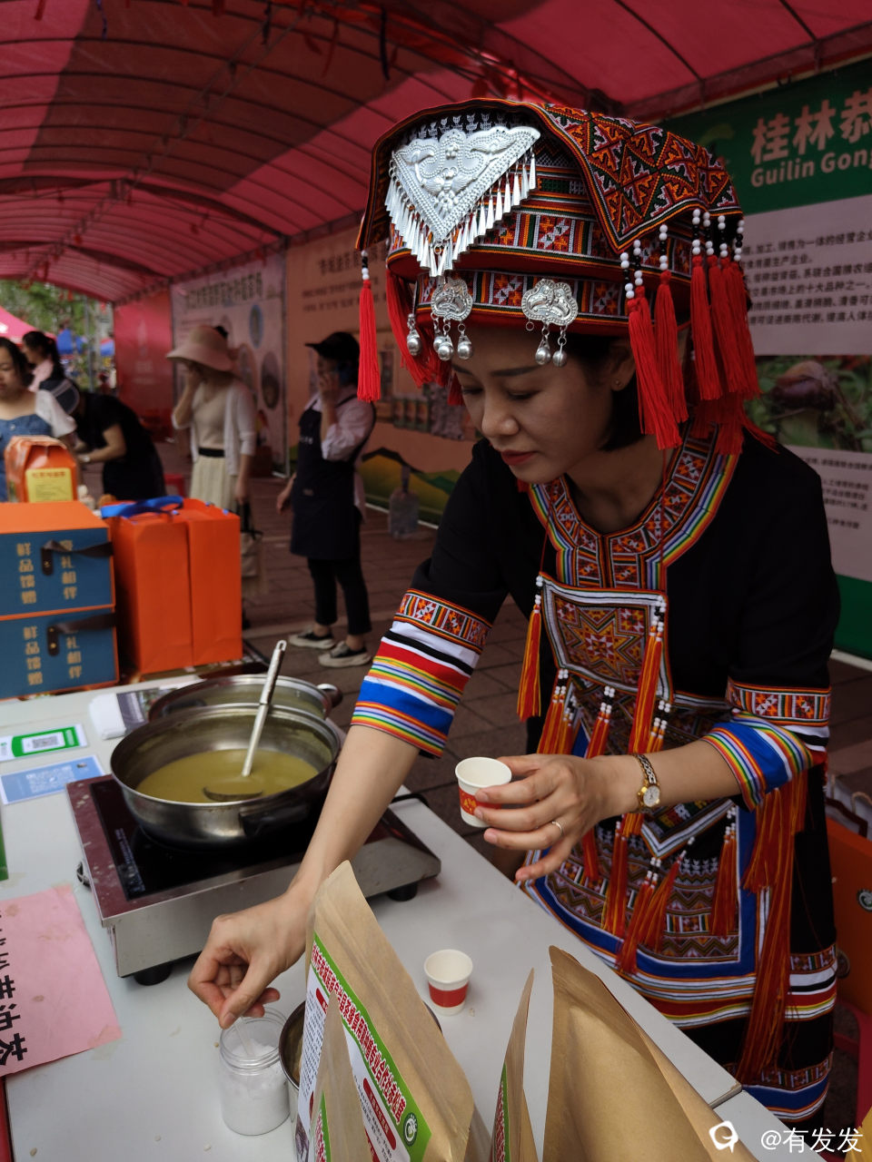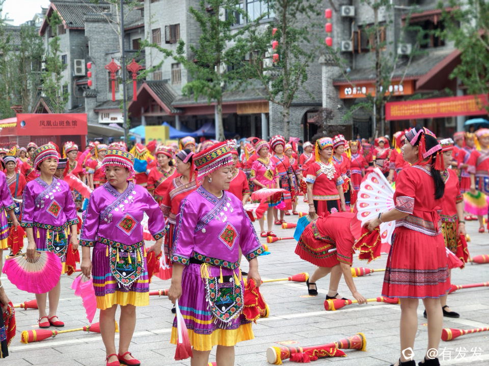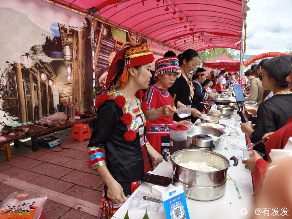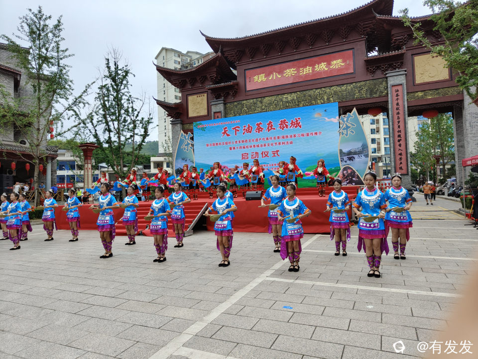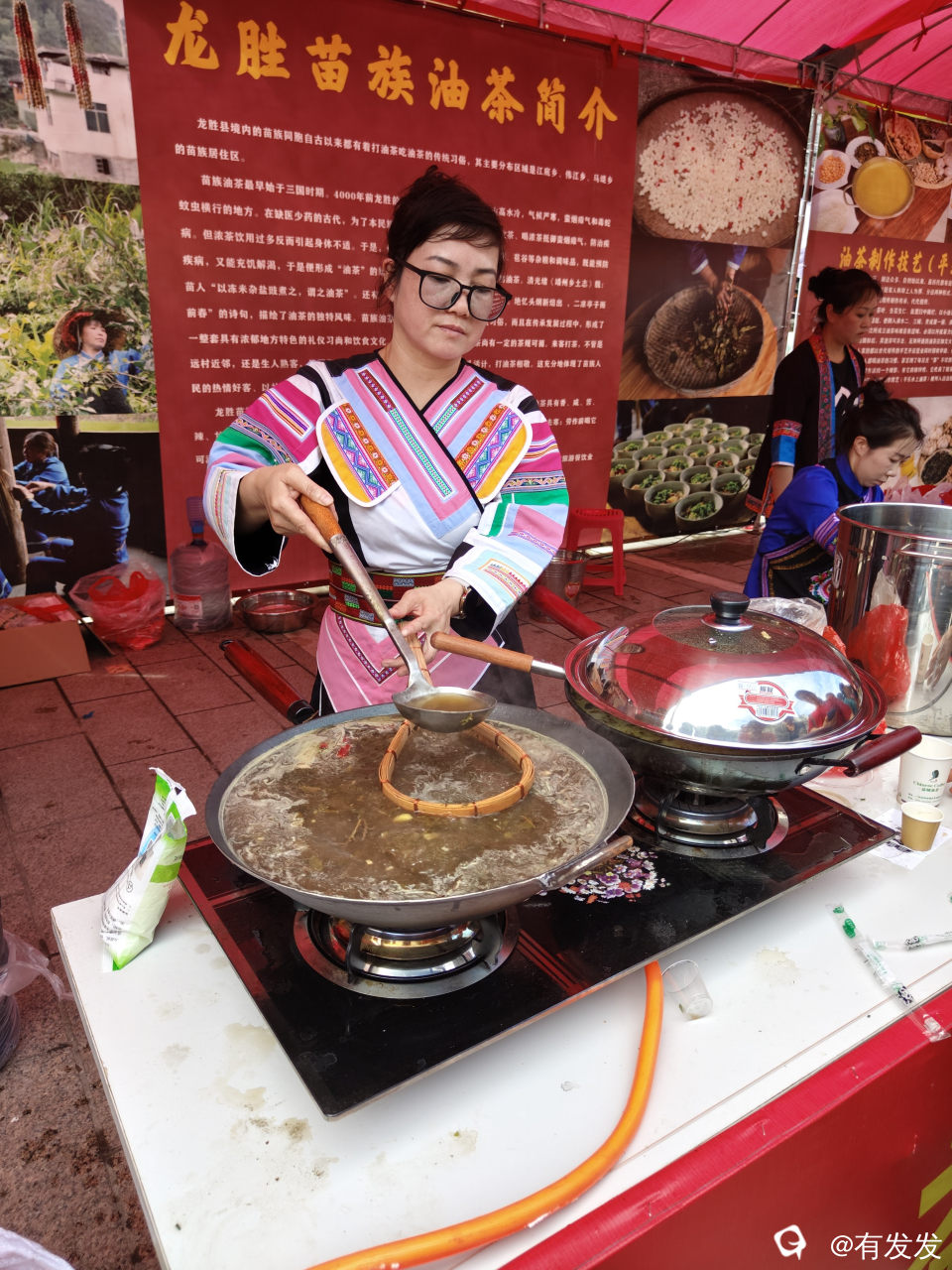 今天的恭城油茶小镇,都处都是穿着艳丽的各种少数民族服装的人群,也有穿汉服的。他们兴高釆烈,跳舞′,表演,打卡拍照,品 品尝油茶。买各种各样的糕点。热闹非凡。 整个工程小镇。成了一个欢乐的海洋。