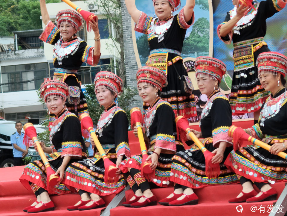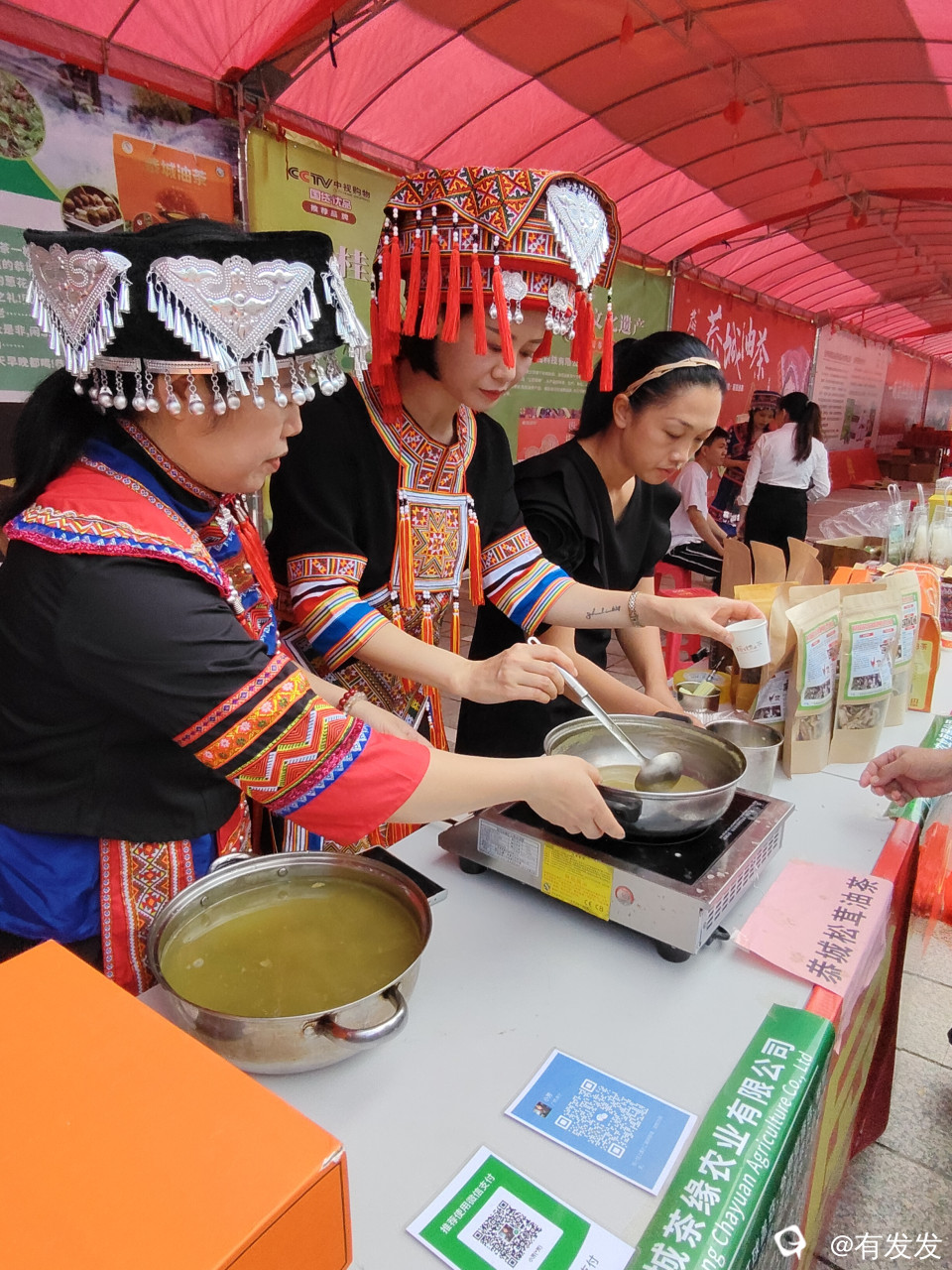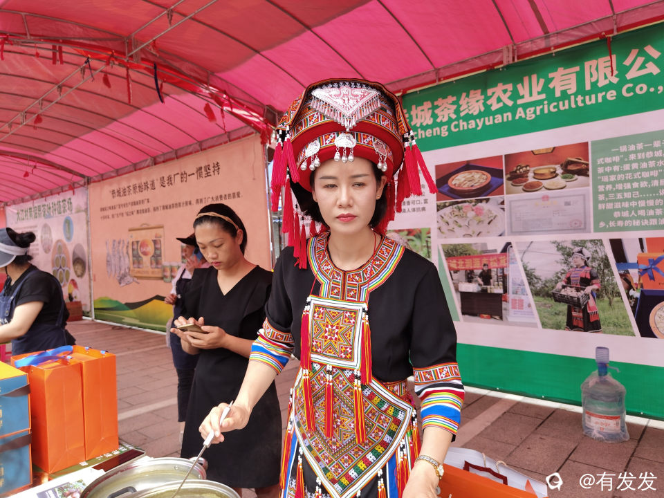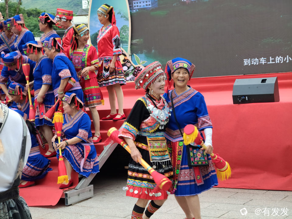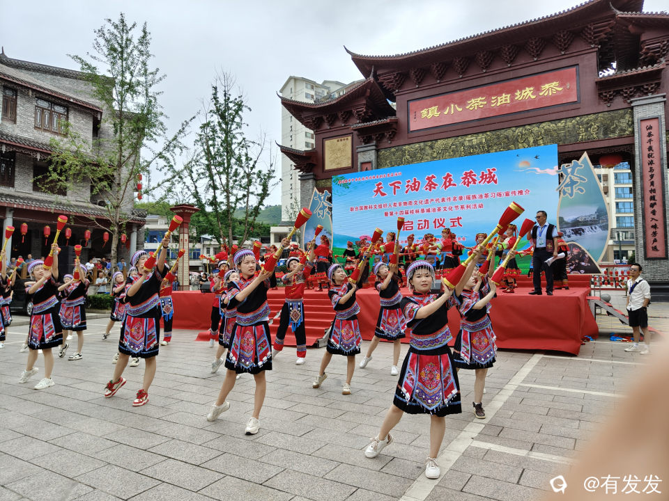今天的恭城油茶小镇,都处都是穿着艳丽的各种少数民族服装的人群,也有穿汉服的。他们兴高釆烈,跳舞′,表演,打卡拍照,品 品尝油茶。买各种各样的糕点。热闹非凡。 整个工程小镇。成了一个欢乐的海洋。