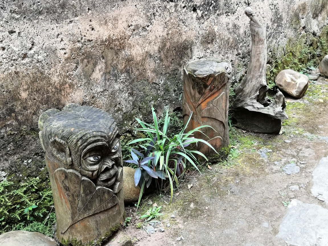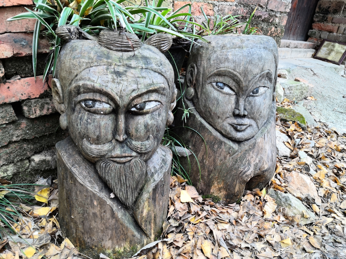 墙边有两座木雕人像,男人束发髻,长眉大眼,八字胡,留长须;女子细眉长眼,殷桃小口。雕像力求简约与神韵的结合,生动细腻,栩栩如生,具有清新自然的艺术感染力!