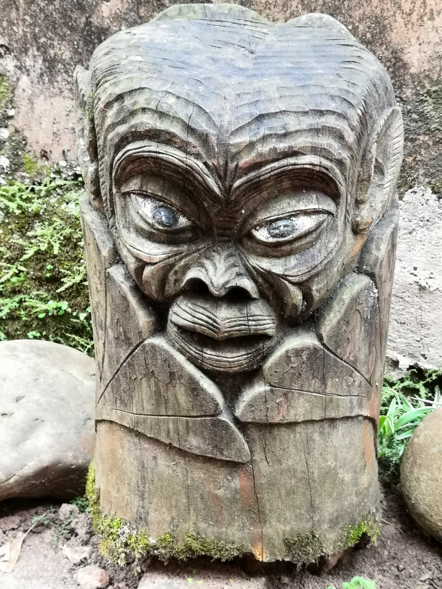 这座根雕怎么看鼻子嘴巴耳朵都像是人类祖先类人猿?还用银杏叶包裹身躯?表情刻画眼睛不敢直视,有种怯生生的眼神。