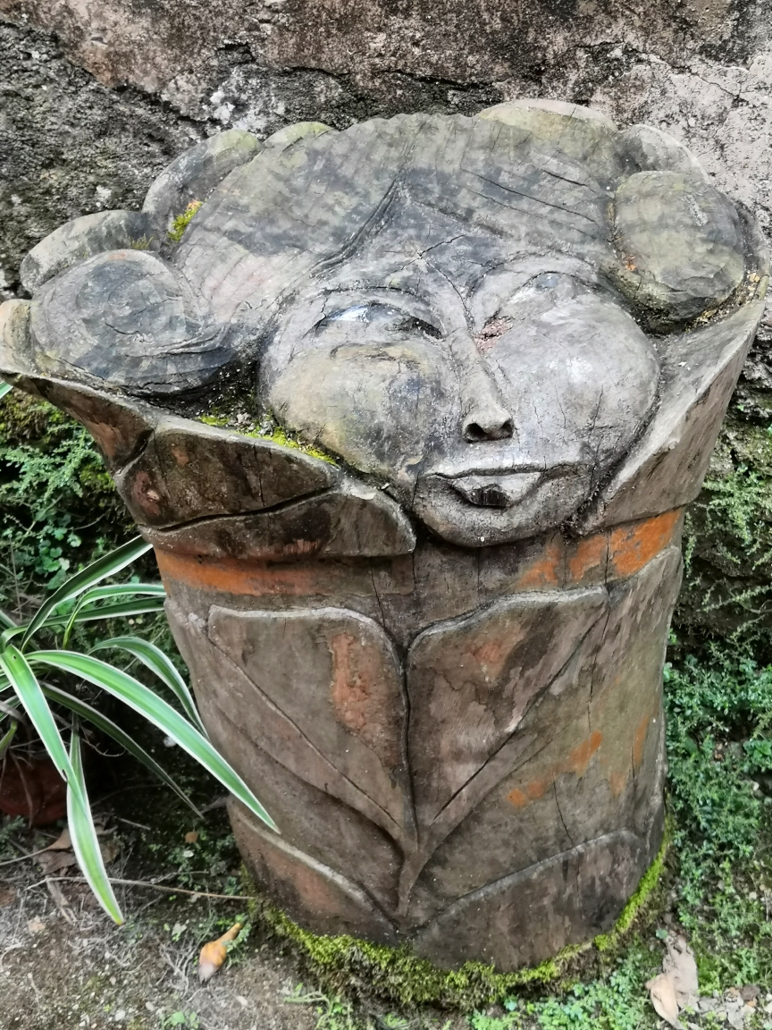 这个根雕姑娘,发髻分两边扎起,脸庞丰满,眼神大胆往上视人。嘴角紧闭,有种不屑一顾的神情。衣领服装都是金黄色的银杏叶图案,显然年代久远服装掉色了!