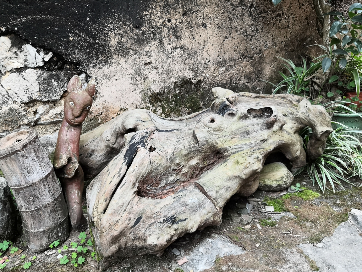 这墙角还有一只三瓣嘴的兔子在好奇地张望着;一段硕大的树根静静地躺在地上,等待根雕师傅把它雕刻成一件艺术作品!