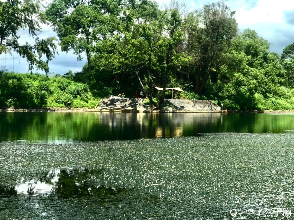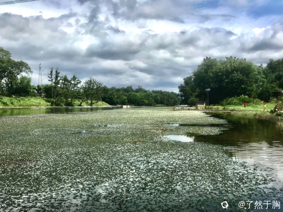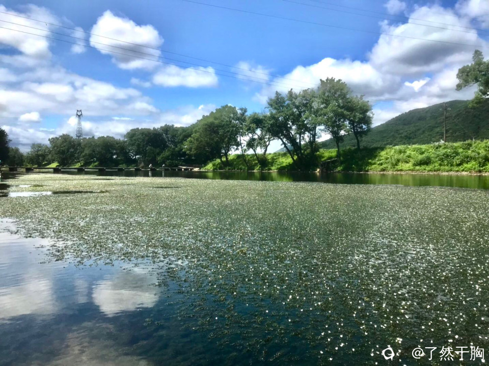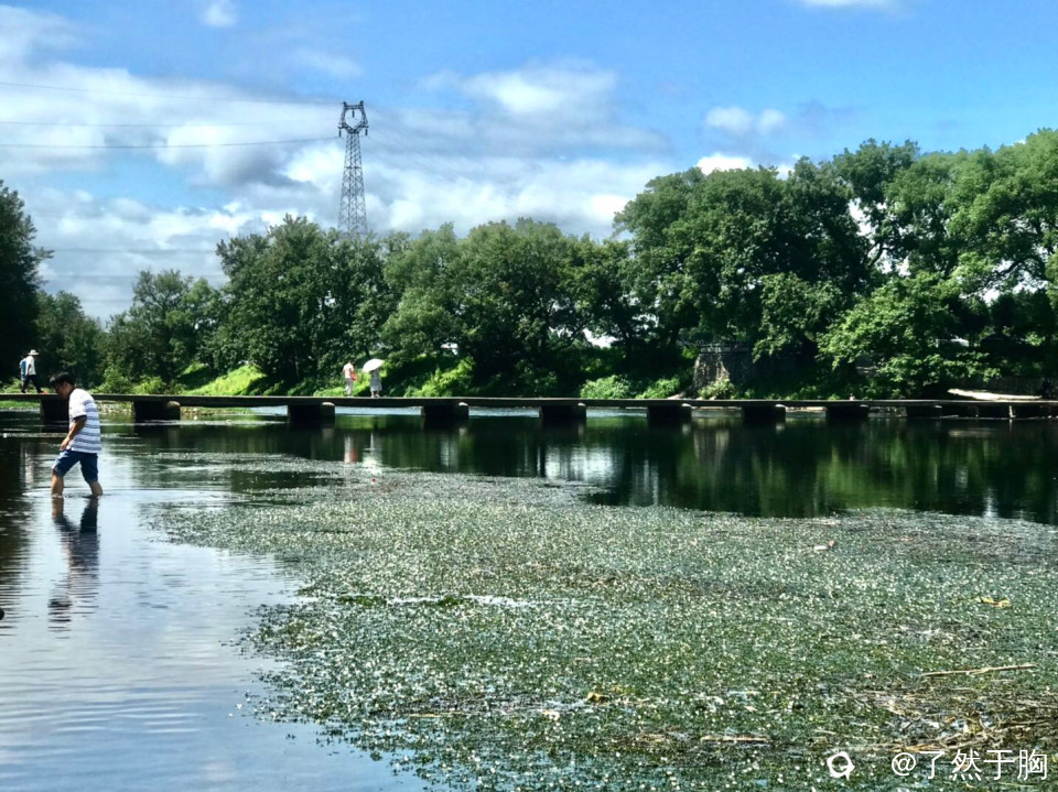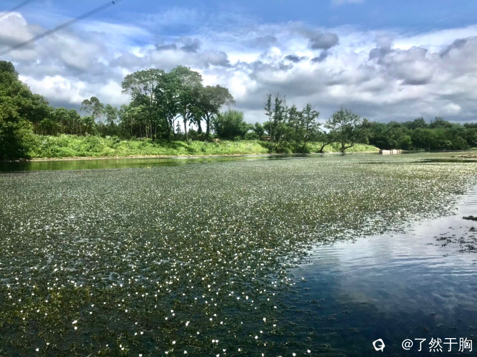 灵川县山口村岭尾渡,由于江水未涨,便桥上游的江面上,大片的蓝丝草长出水面,开出了密密麻麻的白色小花,蓝白相衬,犹如一条巨大的花毯。