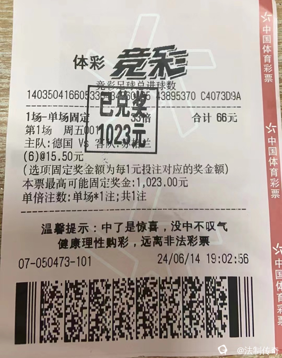 微笑歌歌 发表于 2024-6-17 10:00 没懂买。这张票的意思就是花了66买的,然后德国赢了,就可以中奖1023,是这个意思吧